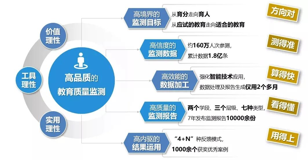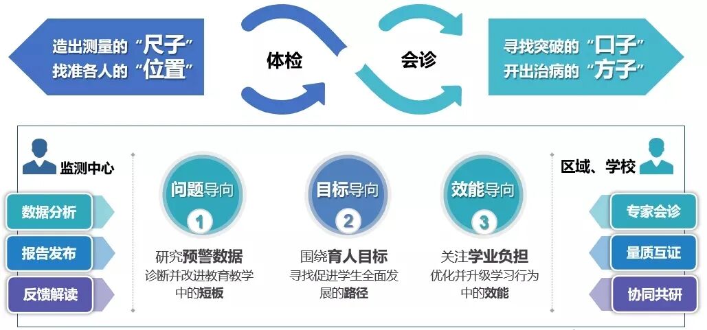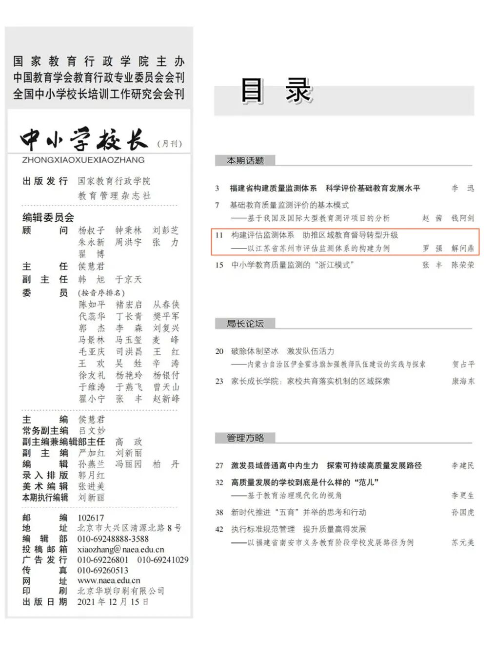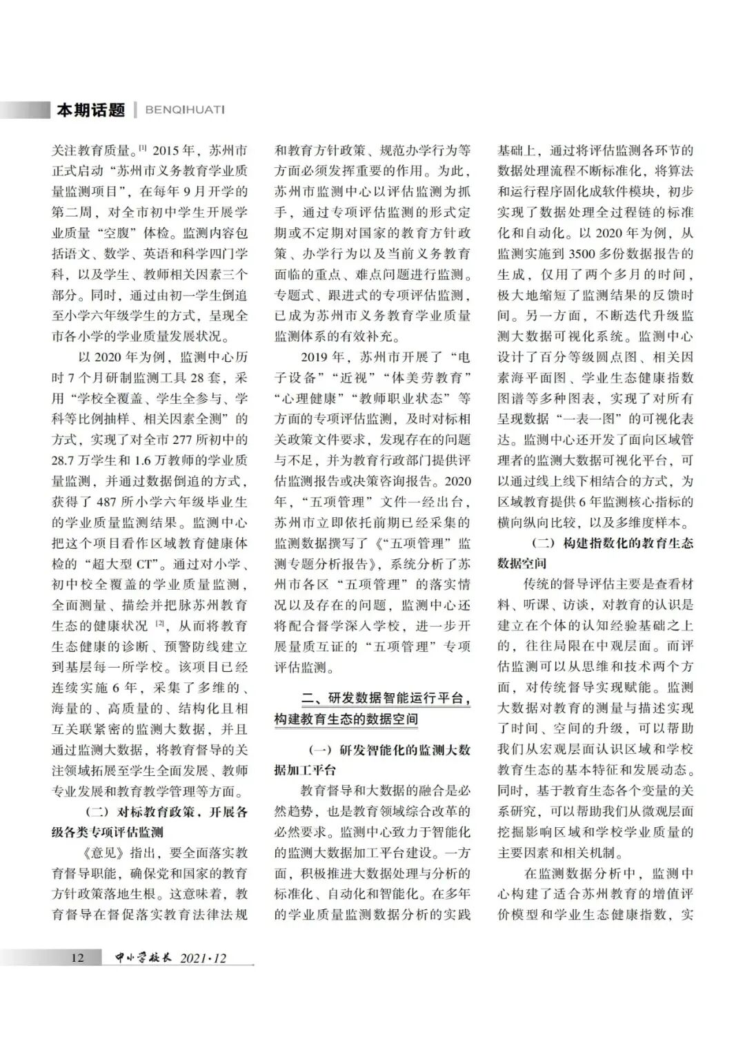 20 22 新年快乐! 第一作者:罗强 苏州市教育质量监测中心主任 第二作者:解问鼎 苏州市教育质量监测中心数据部主任 摘要✦ 近年来,苏州以评估监测为抓手,开展了现代化教育督导体制机制改革。通过建设评估监测体系、研发数据智能运行平台、绘制教育生态健康图谱、联动推进监测结果运用等环节,构建了教育健康的体检中心、教育生态的数据空间、督导评估的预警防线,进而助推区域教育督导转型升级,有力地推动了苏州教育质量的提升。 2020年2月,中共中央办公厅、国务院办公厅印发了《关于深化新时代教育督导体制机制改革的实施意见》(以下简称《意见》),指出要建立教育督导部门统一归口管理、多方参与的教育评估监测机制,为改善教育管理、优化教育决策、指导教育工作提供科学依据,同时要充分利用互联网、大数据、云计算等开展督导评估监测工作。该文件的出台,明确了评估监测在教育督导体系中的重要地位,也为评估监测职能的发挥提供了更加广阔的空间。 2014年2月,在国务院教育督导委员会办公室印发的《深化教育督导改革转变教育管理方式的意见》中,首次提出教育督导的“评估监测”职能后,苏州市于同年9月成立了江苏省首家独立建制、全员配置并专门从事教育质量评估监测工作的单位——苏州市教育质量监测中心(以下简称“监测中心”),率先在机构设置上确立了督政、督学和评估监测三位一体的教育督导体系,为教育督导“评估监测”职能的发挥奠定了基础。监测中心成立7年以来,已经构建了具有“国际视野、国家标准、苏州特色”的区域教育质量评估监测体系,成为推动区域教育督导转型升级的重要力量。 一、致力评估监测体系建设,构建教育健康的体检中心 聚焦质量,开展义务教育学业质量监测 随着基础教育进入内涵式发展阶段,质量和均衡成为基础教育发展的两大主题。教育督导工作也应该由重点关注政府投入、学校硬件、学生入学率等方面,转向重点关注教育质量。[1]2015年,苏州市正式启动“苏州市义务教育学业质量监测项目”,在每年9月开学的第二周,对全市初中学生开展学业质量“空腹”体检。监测内容包括语文、数学、英语和科学四门学科,以及学生、教师相关因素三个部分。同时,通过由初一学生倒追至小学六年级学生的方式,呈现全市各小学的学业质量发展状况。 以2020年为例,监测中心历时7个月研制监测工具28套,采用“学校全覆盖、学生全参与、学科等比例抽样、相关因素全测”的方式,实现了对全市277所初中的28.7万学生和1.6万教师的学业质量监测,并通过数据倒追的方式,获得了487所小学六年级毕业生的学业质量监测结果。监测中心把这个项目看作区域教育健康体检的“超大型CT”。通过对小学、初中校全覆盖的学业质量监测,全面测量、描绘并把脉苏州教育生态的健康状况[2],从而将教育生态健康的诊断、预警防线建立到基层每一所学校。该项目已经连续实施6年,采集了多维的、海量的、高质量的、结构化且相互关联紧密的监测大数据,并且通过监测大数据,将教育督导的关注领域拓展至学生全面发展、教师专业发展和教育教学管理等方面。 对标教育政策,开展各级各类专项评估监测 《意见》指出,要全面落实教育督导职能,确保党和国家的教育方针政策落地生根。这意味着,教育督导在督促落实教育法律法规和教育方针政策、规范办学行为等方面必须发挥重要的作用。为此,苏州市监测中心以评估监测为抓手,通过专项评估监测的形式定期或不定期对国家的教育方针政策、办学行为以及当前义务教育面临的重点、难点问题进行监测。专题式、跟进式的专项评估监测,已成为苏州市义务教育学业质量监测体系的有效补充。 2019年,苏州市开展了“电子设备”“近视”“体美劳教育”“心理健康”“教师职业状态”等方面的专项评估监测,及时对标相关政策文件要求,发现存在的问题与不足,并为教育行政部门提供评估监测报告或决策咨询报告。2020年,“五项管理”文件一经出台,苏州市立即依托前期已经采集的监测数据撰写了《“五项管理”监测专题分析报告》,系统分析了苏州市各区“五项管理”的落实情况以及存在的问题,监测中心还将配合督学深入学校,进一步开展量质互证的“五项管理”专项评估监测。 二、研发数据智能运行平台,构建教育生态的数据空间 研发智能化的监测大数据加工平台 教育督导和大数据的融合是必然趋势,也是教育领域综合改革的必然要求。监测中心致力于智能化的监测大数据加工平台建设。一方面,积极推进大数据处理与分析的标准化、自动化和智能化。在多年的学业质量监测数据分析的实践基础上,通过将评估监测各环节的数据处理流程不断标准化,将算法和运行程序固化成软件模块,初步实现了数据处理全过程链的标准化和自动化。以2020年为例,从监测实施到3500多份数据报告的生成,仅用了两个多月的时间,极大地缩短了监测结果的反馈时间。另一方面,不断迭代升级监测大数据可视化系统。监测中心设计了百分等级圆点图、相关因素海平面图、学业生态健康指数图谱等多种图表,实现了对所有呈现数据“一表一图”的可视化表达。监测中心还开发了面向区域管理者的监测大数据可视化平台,可以通过线上线下相结合的方式,为区域教育提
