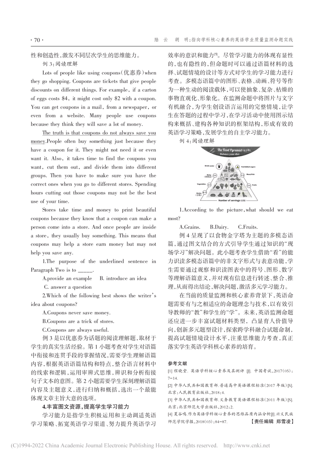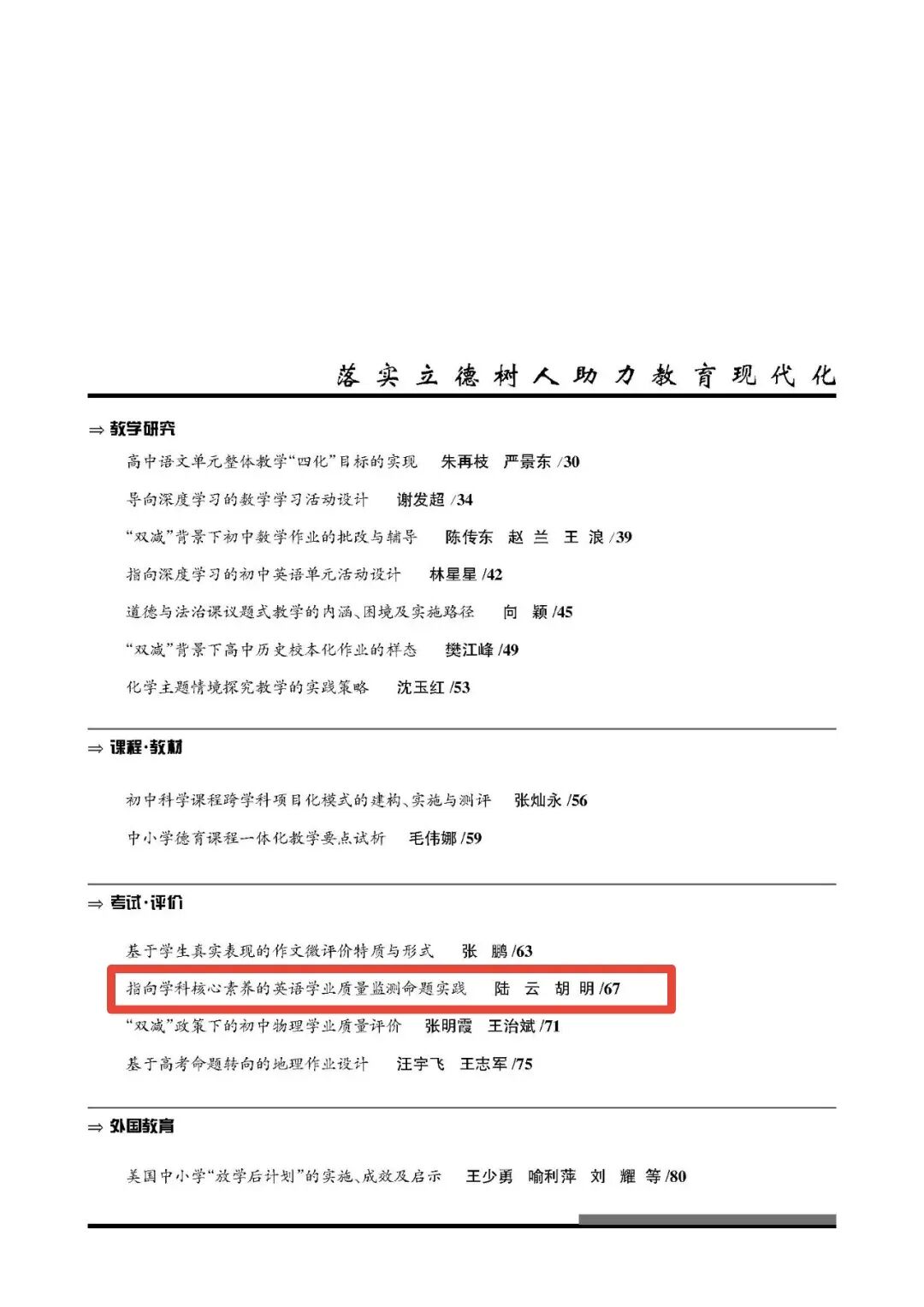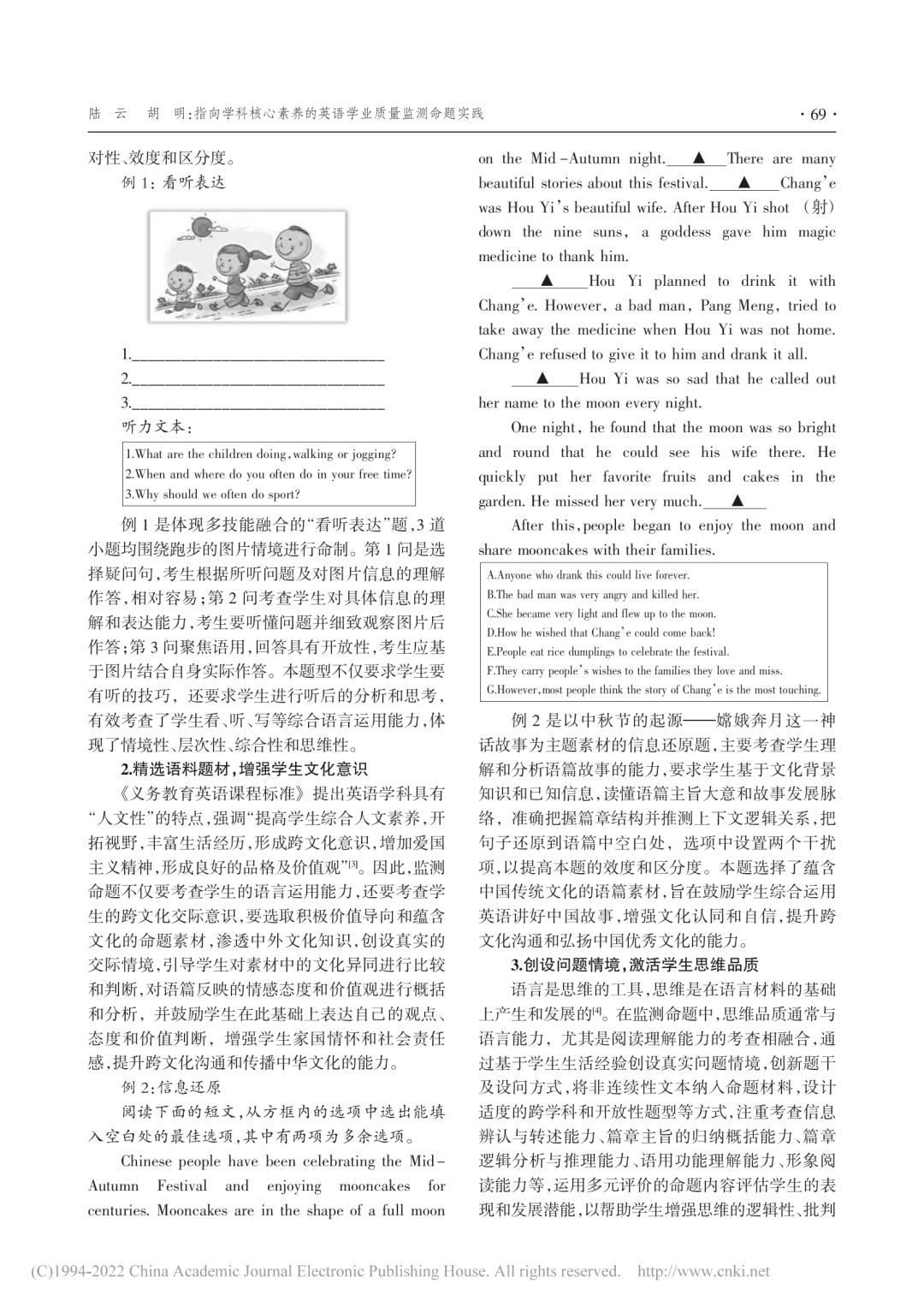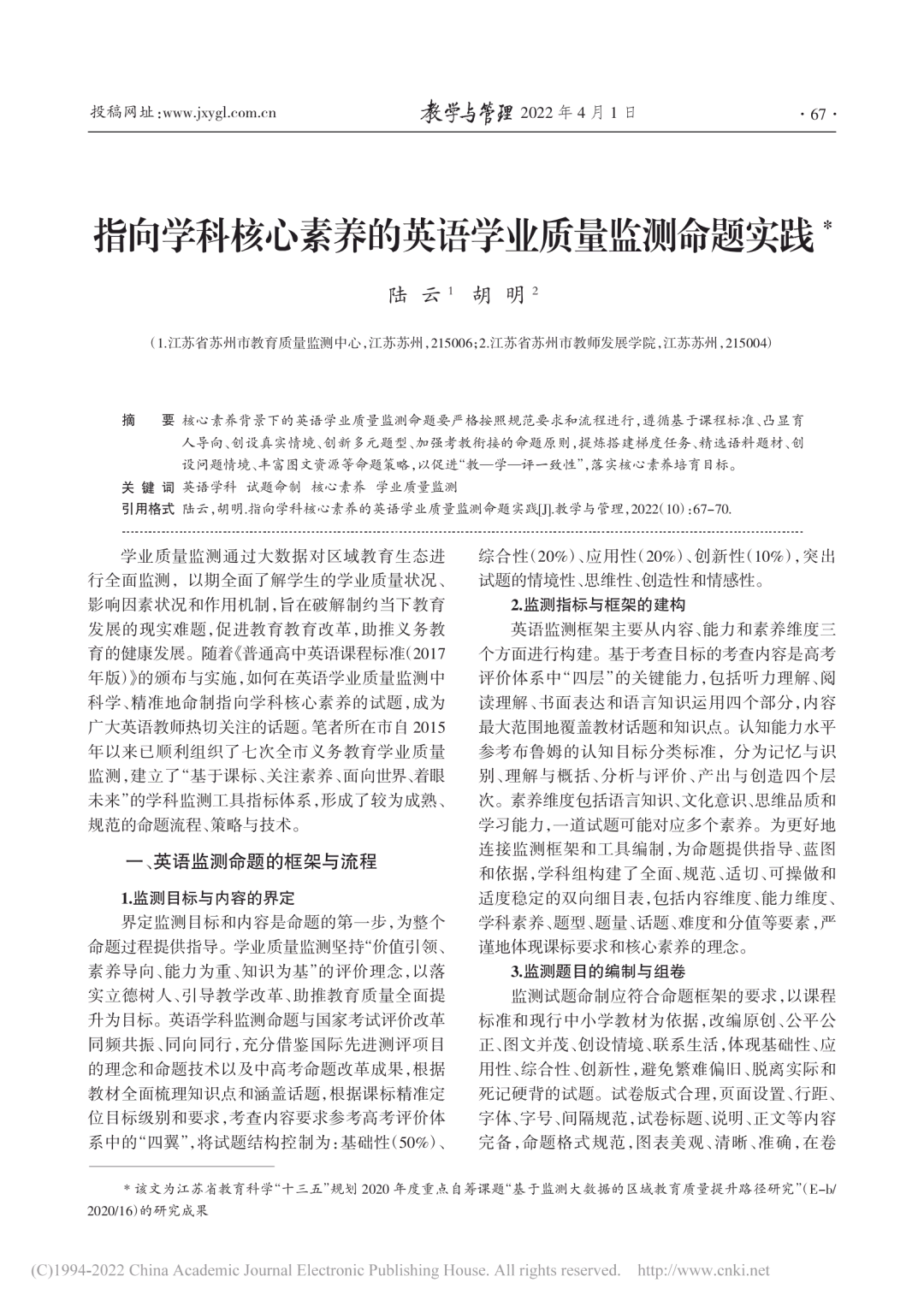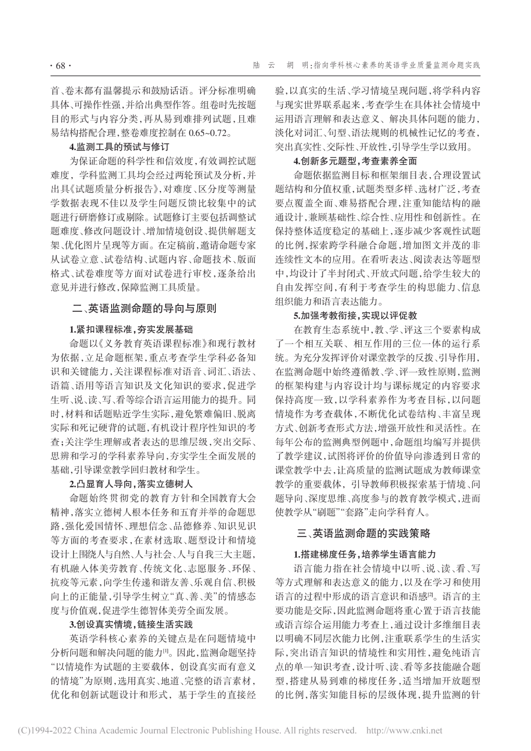 作者:陆云 助理研究员 苏州市教育质量监测中心评估部副主任 作者:胡明 江苏省英语特级教师 原苏州市教师发展中心主任 摘要 核心素养背景下的英语学业质量监测命题要严格按照规范要求和流程进行,遵循基于课程标准、凸显育人导向、创设真实情境、创新多元题型、加强考教衔接的命题原则,提炼搭建梯度任务、精选语料题材、创设问题情境、丰富图文资源等命题策略,以促进“教—学—评一致性”,落实核心素养培育目标。 关键词:英语学科;试题命制;核心素养;学业质量监测 学业质量监测通过大数据对区域教育生态进行全面监测,以期全面了解学生的学业质量状况、影响因素状况和作用机制,旨在破解制约当下教育发展的现实难题,促进教育教育改革,助推义务教育的健康发展。随着《普通高中英语课程标准(2017年版)》的颁布与实施,如何在英语学业质量监测中科学、精准地命制指向学科核心素养的试题,成为广大英语教师热切关注的话题。笔者所在市自2015年以来已顺利组织了七次全市义务教育学业质量监测,建立了“基于课标、关注素养、面向世界、着眼未来”的学科监测工具指标体系,形成了较为成熟、规范的命题流程、策略与技术。 一、英语监测命题的框架与流程 界定监测目标和内容是命题的第一步,为整个命题过程提供指导。学业质量监测坚持“价值引领、素养导向、能力为重、知识为基”的评价理念,以落实立德树人、引导教学改革、助推教育质量全面提升为目标。英语学科监测命题与国家考试评价改革同频共振、同向同行,充分借鉴国际先进测评项目的理念和命题技术以及中高考命题改革成果,根据教材全面梳理知识点和涵盖话题,根据课标精准定位目标级别和要求,考查内容要求参考高考评价体系中的“四翼”,将试题结构控制为:基础性(50%)、综合性(20%)、应用性(20%)、创新性(10%),突出试题的情境性、思维性、创造性和情感性。 英语监测框架主要从内容、能力和素养维度三个方面进行构建。基于考查目标的考查内容是高考评价体系中“四层”的关键能力,包括听力理解、阅读理解、书面表达和语言知识运用四个部分,内容最大范围地覆盖教材话题和知识点。认知能力水平参考布鲁姆的认知目标分类标准,分为记忆与识别、理解与概括、分析与评价、产出与创造四个层次。素养维度包括语言知识、文化意识、思维品质和学习能力,一道试题可能对应多个素养。为更好地连接监测框架和工具编制,为命题提供指导、蓝图和依据,学科组构建了全面、规范、适切、可操做和适度稳定的双向细目表,包括内容维度、能力维度、学科素养、题型、题量、话题、难度和分值等要素,严谨地体现课标要求和核心素养的理念。 监测试题命制应符合命题框架的要求,以课程标准和现行中小学教材为依据,改编原创、公平公正、图文并茂、创设情境、联系生活,体现基础性、应用性、综合性、创新性,避免繁难偏旧、脱离实际和死记硬背的试题。试卷版式合理,页面设置、行距、字体、字号、间隔规范,试卷标题、说明、正文等内容完备,命题格式规范,图表美观、清晰、准确,在卷首、卷末都有温馨提示和鼓励话语。评分标准明确具体、可操作性强,并给出典型作答。组卷时先按题目的形式与内容分类,再从易到难排列试题,且难易结构搭配合理,整卷难度控制在0.65~0.72。 为保证命题的科学性和信效度,有效调控试题难度,学科监测工具均会经过两轮预试及分析,并出具《试题质量分析报告》,对难度、区分度等测量学数据表现不佳以及学生问题反馈比较集中的试题进行研磨修订或剔除。试题修订主要包括调整试题难度、修改问题设计、增加情境创设、提供解题支架、优化图片呈现等方面。在定稿前,邀请命题专家从试卷立意、试卷结构、试题内容、命题技术、版面格式、试卷难度等方面对试卷进行审校,逐条给出意见并进行修改,保障监测工具质量。 二、英语监测命题的导向与原则 命题以《义务教育英语课程标准》和现行教材为依据,立足命题框架,重点考查学生学科必备知识和关键能力,关注课程标准对语音、词汇、语法、语篇、语用等语言知识及文化知识的要求,促进学生听、说、读、写、看等综合语言运用能力的提升。同时,材料和话题贴近学生实际,避免繁难偏旧、脱离实际和死记硬背的试题,有机设计程序性知识的考查;关注学生理解或者表达的思维层级,突出交际、思辨和学习的学科素养导向,夯实学生全面发展的基础,引导课堂教学回归教材和学生。 命题始终贯彻党的教育方针和全国教育大会精神,落实立德树人根本任务和五育并举的命题思路,强化爱国情怀、理想信念、品德修养、知识见识等方面的考查要求,在素材选取、题型设计和情境设计上围绕人与自然、人与社会、人与自我三大主题,有机融入体美劳教育、传统文化、志愿服务、环保、抗疫等元素,向学生传递和谐友善、乐观自信、积极向上的正能量,引导学生树立“真、善、美”的情感态度与价值观,促进学生德智体美劳全面发展。 英语学科核心素养的关键点是在问题情境中分析问题和解决问题的能力[1]。因此,监测命题坚持“以情境作为试题的主要载体,创设真实而有意义的情境”为原则,选用真实、地道、完整的语言素材,优化和创新试题设计和形式,基于学生