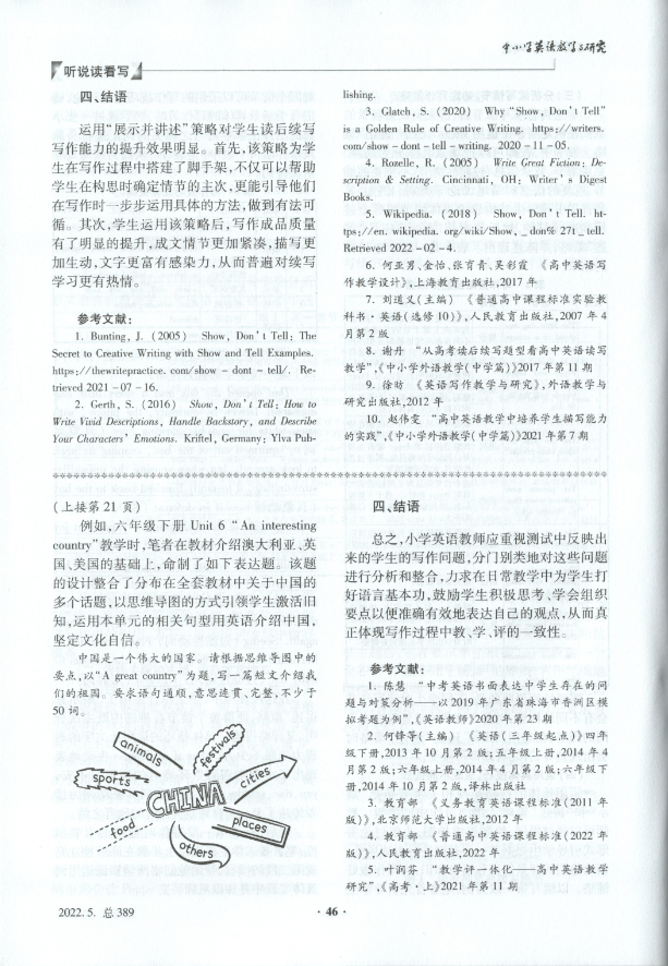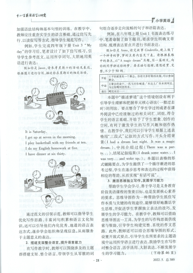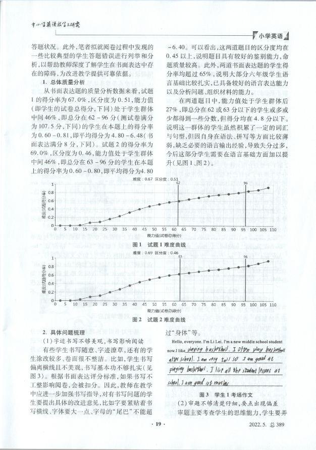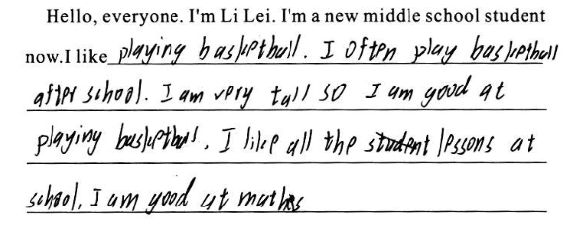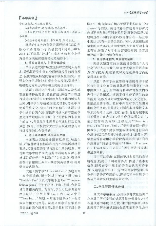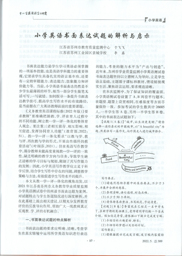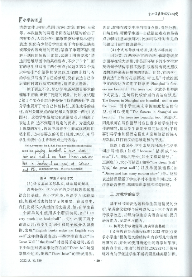 文章来源:《中小学英语教学与研究》2022年第5期 作者:于飞飞 苏州市教育质量监测中心 助理研究员 作者:李磊 苏州工业园区景城学校 中小学一级教师 书面表达能力是学生学习英语必须掌握的一项基本技能,也是英语学科能力的重要体现,它要求学生具备扎实的语言基本功,还要有一定的审题能力、表达能力、想象能力和评价能力等。当前,小学英语书面表达仍然是不少学生最薄弱的环节,相当一部分学生提笔无话可写、一写就错。如何探寻一条提升书面表达教学技巧、提高学生写作水平的有效路径,是当前摆在广大英语教师面前的重要课题。 《义务教育英语课程标准(2022年版)》要求教师“要准确把握教、学、评在育人过程中的不同功能,树立教—学—评的整体育人观念。要注重三者相互依存、相互影响、相互促进,发挥协同育人功能。”(教育部,2022:51)。教、学、评一体化要求“以教与学、教与评、再次教与学的形式,开展良性循环的教育活动”(叶润芬,2021)。但在写作教学中,部分英语教师未能高度重视教、学、评的一致性,缺乏明确的教学方向与任务,导致学生缺乏清晰的学习目标与规划,限制了其写作能力的发展。因此,小学英语写作教学应立足于科学反馈,结合学生写作中存在的问题,调整教学策略与方法,有效促进学生写作水平的提升。 本文从教—学—评一体化的视角出发,以2021年江苏省苏州市义务教育学业质量监测小学英语测试卷中的两道书面表达题为案例,对试题特点与学生答题情况进行深度解析,并在此基础上提出相关建议,以期充分发挥教育评价的反拨导向作用,帮助广大一线教师真正实现教、学、评的有机融合。 书面表达试题的特点解析 书面表达题的要求应明确、清晰,考查学生在真实情境中运用所学英语知识进行表达的能力,考查的能力水平为“产出与创造”。近年来,苏州市学业质量监测小学英语测试卷书面表达题坚持以立德树人为导向,立足学生语言基础,主题源于课标和教材,情境链接现实生活,聚焦语言运用,要求规范清晰。 在本次监测中,为了保证知识的覆盖面,小学英语测试卷设置了A、B两套平行题本,在题型、题量上设置相同,在难易度等方面尽量保持一致。参加考试的学生人数共26685人,其中一半学生答A卷,另外一半学生答B卷。其中的书面表达题如下: 【试题1(A卷)】 “城市,让生活更美好。”请你选择一座你喜欢的中国城市,以“A beautiful city”为题,用英语写一篇作文,向外国友人进行城市推介。 写作要求: (1)请选用思维导图中的某些要点,不少于3个,并展开合理的想象。 (2)条理清晰,语句通顺,时态正确。 (3)不少于50个单词。 (4)请保持卷面整洁、书写规范、字迹清楚。 【试题2(B卷)】 李雷现在已经是一名中学生了,在新学期的英语课上,老师请同学们做一个自我介绍。假如你是李雷,请根据以下提示完成发言稿: (1)介绍你的兴趣爱好、特长; (2)介绍你的梦想以及你的计划。 写作要求: (1)请根据提示完成发言稿,发言稿内容需结合以上要点,可以适当补充。 (2)条理清晰,语句通顺,时态正确。 (3)不少于50个单词,文章已给出部分不计入总词数。 (4)请保持卷面整洁、书写规范、字迹清楚。 现结合《义务教育英语课程标准(2022年版)》和译林版小学英语教材(何峰,2013/2014;以下简称“教材”),将本次监测中小学英语书面表达试题的特点总结如下: 书面表达试题的设置坚持以立德树人为根本,秉承促进学生身心全面健康发展的教育理念,促使学生从特定的情境中汲取爱国养分、增强文化自信,同时关注学生个人发展,引导学生明确努力方向,具有积极正向的价值导向。 试题1通过让学生对中国城市以及各城市独有的特色美食、名胜古迹、传统节日等进行描述,加强学生对地域特点与文化的感知与认同,引导学生厚植爱国主义情怀,传承中华优秀传统文化,坚定“四个自信”。试题2让学生进行自我介绍,帮助即将进入青春期的学生更加清晰地认识自我、明确自己特长和未来奋斗的方向,并激发学生思考如何通过行动实现梦想,体现了学校教育关注学生职业理想与可持续发展的社会责任感。 书面表达试题的命制靠近课堂、贴近生活,既严格按照课程标准和现行小学英语教材要求,又重视英语学习与现实生活的联系。在测试卷中,两道书面表达题的话题均来源于教材,以“促使学生学以致用”为出发点,引导学生在语言输出任务中不断夯实英语基础、提升语言表达能力。 试题1要求以“A beautiful city”为题介绍一座中国城市,源于教材中六年级上册Unit3“Holiday Fun”中关于北京、上海等城市的相关内容,以及六年级下册Unit7 “Summer holiday plans”中关于上海、香港、台北等城市的相关内容。写作时,学生可以参考的句型还包括五年级上册Unit1和Unit2中的“There be…”句型、六年级下册Unit6 “An interesting country”中介绍国家的相关句型等。试题2要求帮助李雷完成发言稿进行自我介绍,源于教材五年级上册Unit4 “My hobbies”和六年级下册Unit8 “Our dreams”等内容。这两道试题要求写作的内容都是教材不同年级、不同单元里涉及到的话题,试题将这些不同的话题巧妙地糅合在一起让学生表达,具有一定的灵活性。另一方面,这两道书面表达试题很贴近学生的生活实际,让学生感到亲切且写起来言之有物,体现了对学生语言基础知识、语言组织及输出能力