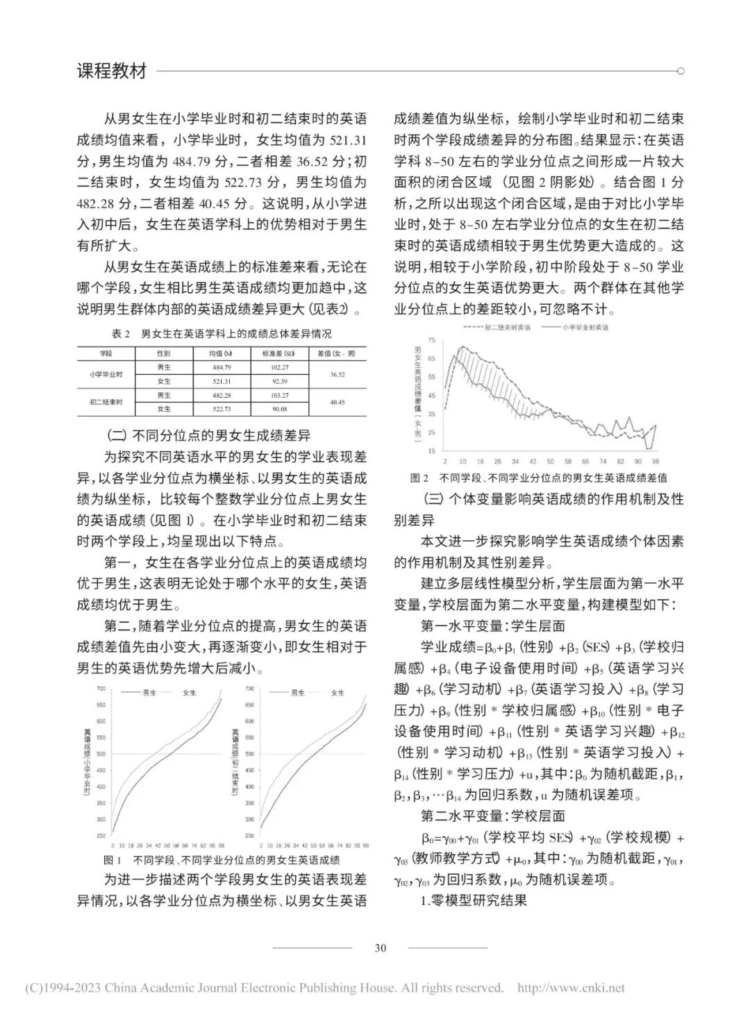 为什么在相似教育环境下的男女生,英语成绩会存在两个性别群体的显著差异?这种差异形成的内在机制是什么?回顾以往研究,甚少有研究者以实证的方式深入探讨男女生英语成绩差异背后的成因,即便有也仅聚焦于某一或几个特定因素的探索,鲜见将家庭、学校与个体三方面因素共同纳入同一教育生态系统中进行讨论的。此外,现有研究往往利用一次考试成绩展开分析,缺乏数据的连贯性,无法对英语成绩性别差异的纵向变化做出准确判断。