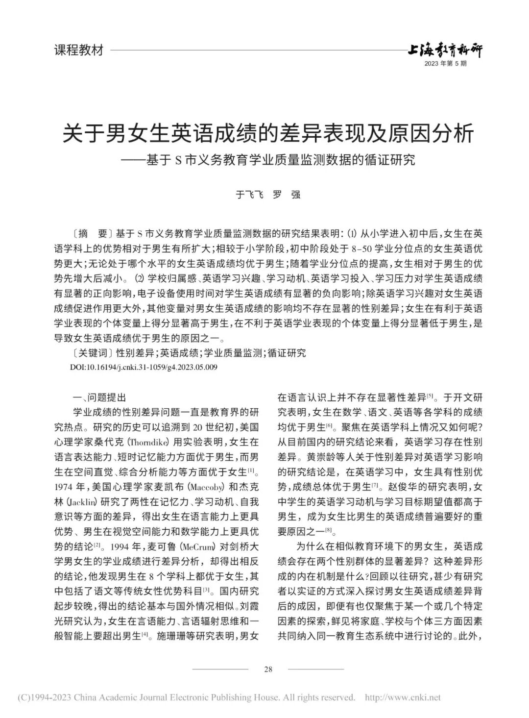 【关键词】性别差异;英语成绩;学业质量监测;循证研究