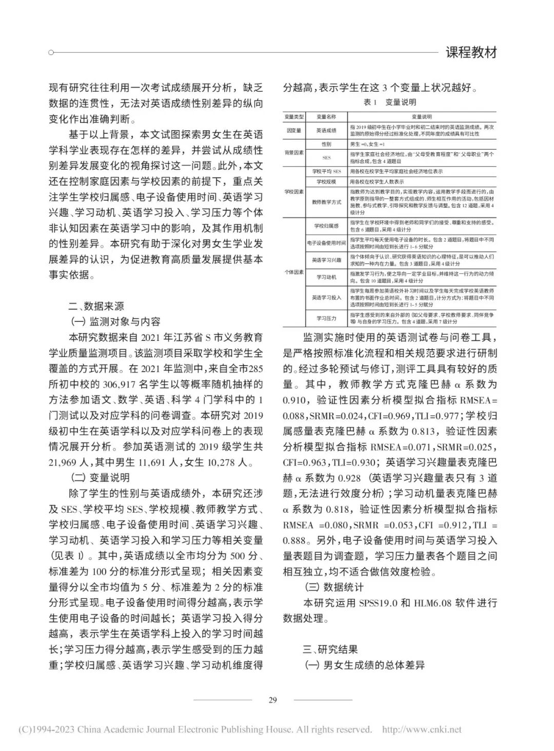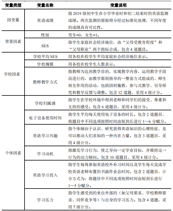 基于以上背景,本文试图探索男女生在英语学科学业表现存在怎样的差异,并尝试从成绩性别差异发展变化的视角来探讨这一问题。此外,本文还在控制家庭因素与学校因素的前提下,重点关注学生学校归属感、电子设备使用时间、英语学习兴趣、学习动机、英语学习投入、学习压力等个体非认知因素在英语学习中的影响,及其作用机制的性别差异。本研究有助于深化我们对男女生学业发展差异的认识,为促进教育高质量发展提供基本事实依据。