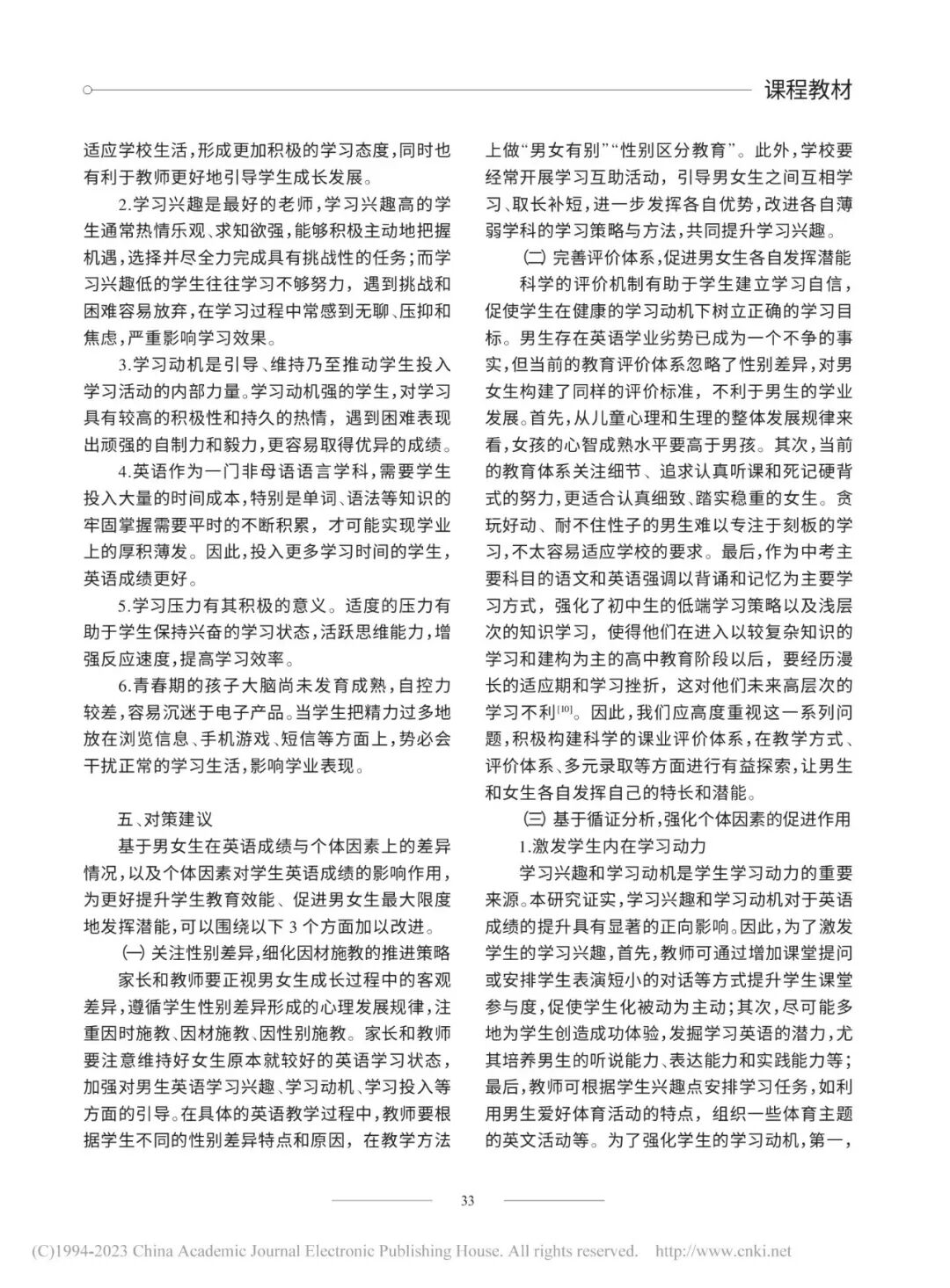 学习兴趣和学习动机是学生学习动力的重要来源。本研究证实,学习兴趣和学习动机对于英语成绩的提升具有显著的正向影响。因此,为了激发学生的学习兴趣,教师首先可通过增多课堂提问或安排学生表演短小的对话等,提升学生课堂参与度,促使学生化被动为主动;其次,尽可能多地为学生创造成功体验,发掘学习英语的潜力,尤其培养男生的听说能力、表达能力和实践能力等;第三,教师可根据学生兴趣点安排学习任务,如利用男生爱好体育活动的特点,组织一些体育主题的英文活动等。为了强化学生的学习动机,教师首先要让学生明白英语学习的重要性,使其主动地投入到英语学习中去;其次要创设贴近学生生活的问题情境,引起学生对新学习内容的注意,调动积极性;最后要正确实施奖惩,多给予学生基于事实的表扬肯定,对于学生的错误行为要减少批评、多加引导。