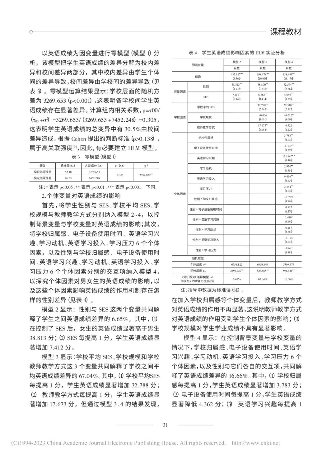 模型3显示:学校平均SES、学校规模和学校教师教学方式这三个变量共同解释了学校之间平均英语成绩差异的67.04%。其中,(1)学校平均SES每提高1分,学生英语成绩显著增加32.788分;(2)教师教学方式每提高1分,学生英语成绩显著增加17.673分,但通过模型3~4的结果发现,在加入学校归属感等个体变量后,教师教学方式对英语成绩的作用不再显著,这说明教师教学方式对英语成绩的作用受到学生个体因素的影响;(3)学校规模对学生学业成绩不具有显著影响。