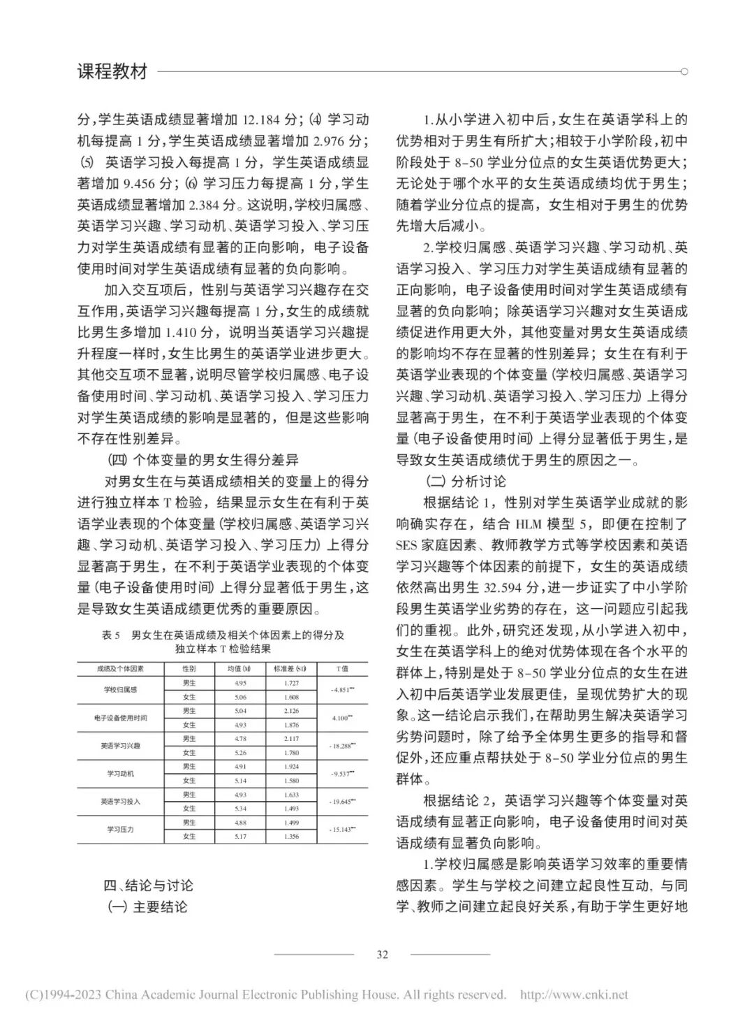 □2. 学校归属感、英语学习兴趣、学习动机、英语学习投入、学习压力对学生英语成绩有显著的正向影响,电子设备使用时间对学生英语成绩有显著的负向影响;除英语学习兴趣对女生英语成绩促进作用更大外,其他变量对男女生英语成绩的影响均不存在显著的性别差异;女生在有利于英语学业表现的个体变量(学校归属感、英语学习兴趣、学习动机、英语学习投入、学习压力)上得分显著高于男生,在不利于英语学业表现的个体变量(电子设备使用时间)上得分显著低于男生,是导致女生英语成绩优于男生的原因之一。