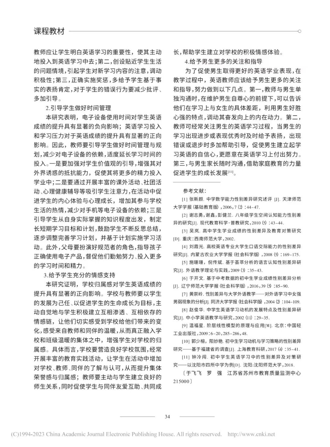 本研究证明,女生在有利于英语学业表现的个体变量(学校归属感、英语学习兴趣、学习动机、英语学习投入、学习压力)上得分显著高于男生,在不利于英语学业表现的个体变量(电子设备使用时间)上得分显著低于男生,是导致女生英语成绩优于男生的原因之一。为了促使男生取得更好的英语学业表现,在教学过程中,英语教师应该给予男生更多的关注和指导,努力做到以下几点。第一,教师与男生单独沟通时,在维护男生自尊心的前提下,可以告诉他们在学习上与女生的具体差距,利用男生好胜心强的特点,调动其奋发向上的内在动力。第二,教师可经常关注男生的英语学习过程,当男生的学习出现进步或表现优秀时要及时给予表扬,出现错误或退步时多加帮助引导,促使男生建立起学习英语的自信心,更愿意在英语学习上付出努力。第三,与男生家长随时沟通,借助家庭教育的力量促进学生的成长发展[11]。