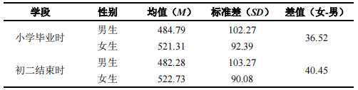从男女生在小学毕业时和初二结束时的英语成绩均值来看,小学毕业时,女生均值为521.31分,男生均值为484.79分,二者相差了36.52分;初二结束时,女生均值为522.73分,男生均值为482.28分,二者相差了40.45分。这说明,从小学进入初中后,女生在英语学科上的优势相对于男生有所扩大。