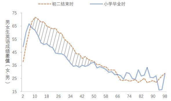 为进一步描述两个学段男女生的英语表现差异情况,以各学业分位点为横坐标、以男女生英语成绩差值为纵坐标,绘制小学毕业时和初二结束时两个学段成绩差异的分布图。结果显示:在英语学科8~50左右的学业分位点之间形成一片较大面积的闭合区域(见图2阴影处)。结合图1分析,之所以出现这个闭合区域,是由于对比小学毕业时,处于8~50左右学业分位点的女生在初二结束时的英语成绩相较于男生优势更大造成的。这说明,相较于小学阶段,初中阶段处于8~50学业分位点的女生英语优势更大。两个群体在其他学业分位点上的差距较小,忽略不计。