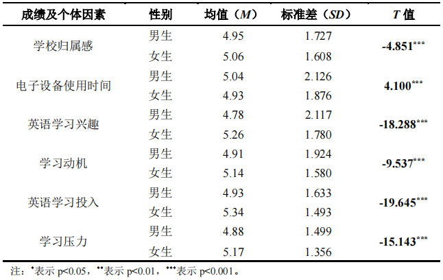 对男女生在与英语成绩相关的变量上的得分进行独立样本T检验,结果显示:女生在有利于英语学业表现的个体变量(学校归属感、英语学习兴趣、学习动机、英语学习投入、学习压力)上得分显著高于男生,在不利于英语学业表现的个体变量(电子设备使用时间)上得分显著低于男生,这是导致女生英语成绩更优秀的重要原因。