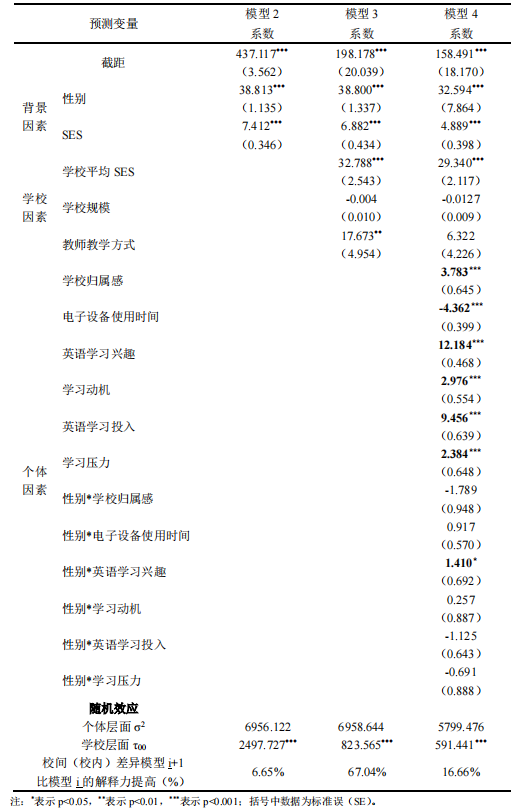 学业成绩=β0+β1(性别)+β2(SES)+β3(学校归属感)+β4(电子设备使用时间)+β5(英语学习兴趣)+β6(学习动机)+β7(英语学习投入)+β8(学习压力)+β9(性别*学校归属感)+β10(性别*电子设备使用时间)+β11(性别*英语学习兴趣)+β12(性别*学习动机)+β13(性别*英语学习投入)+β14(性别*学习压力)+u,其中:β0为随机截距,β1,β2,β3,…,β14为回归系数,u为随机误差项。