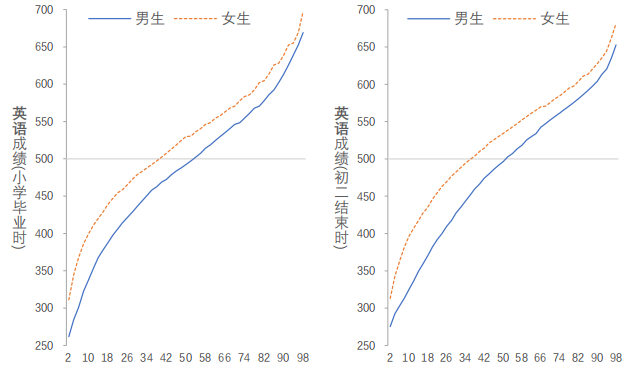 第一,女生在各学业分位点上的英语成绩均优于男生,这表明无论处于哪个水平的女生,英语成绩均优于男生;