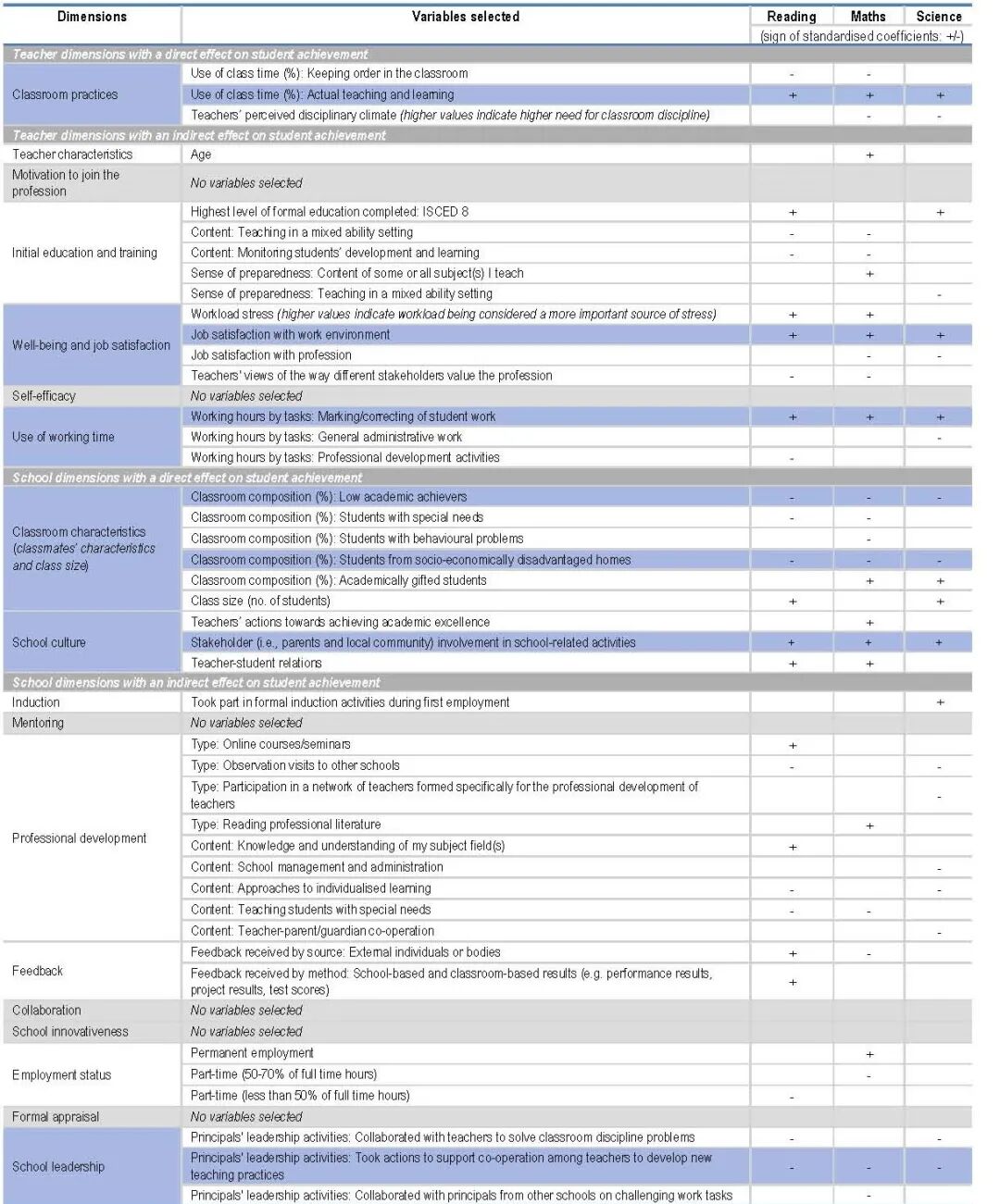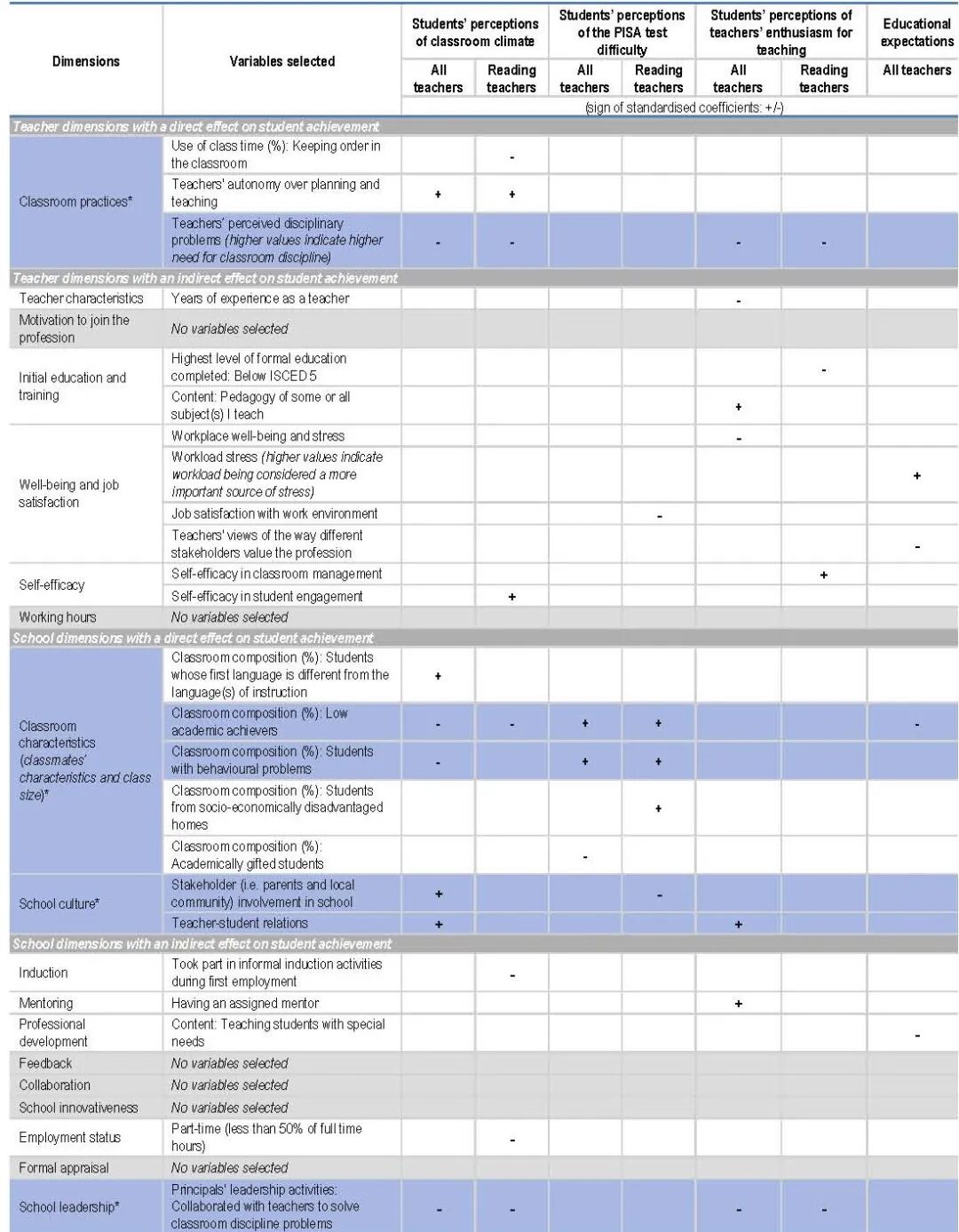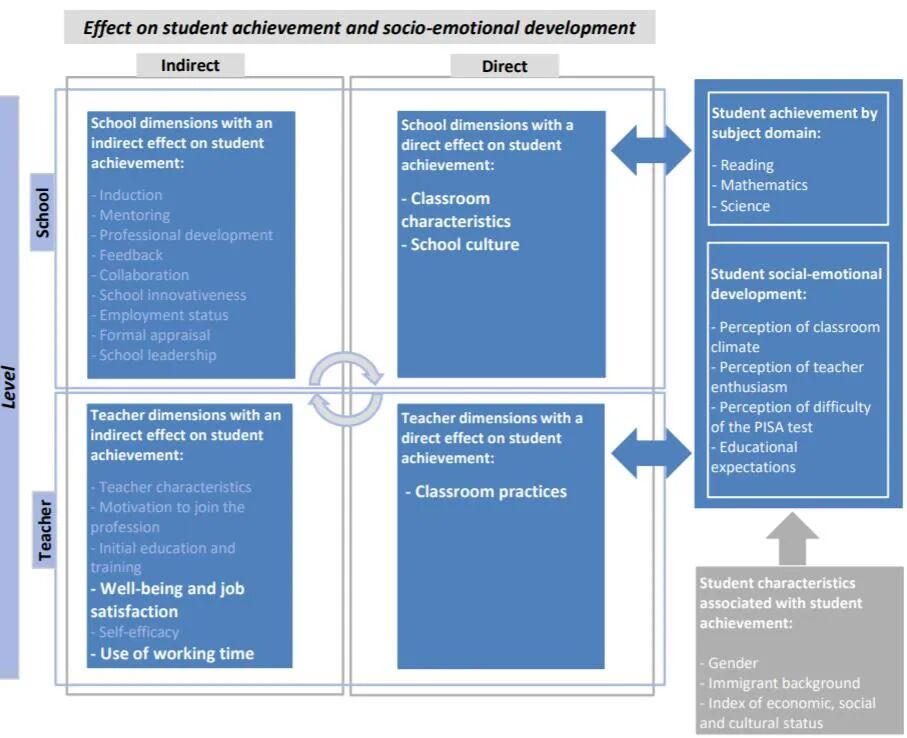 学校因素中,直接影响维度包括2个,具体为“班级特征”和“学校文化”2个,间接影响维度包括9个,具体为“入职培训”、“辅导”、“专业发展”、“反馈”、“协作”、“学校创新”、“教师雇佣状况”、“教师评估”和“学校领导”9个。对于学生学习成绩指标,报告使用的是PISA阅读、数学和科学的成绩;对于学生社会情感发展指标,使用的为“学生对课堂氛围的感知”、“学生对PISA难度的感知”、“学生对教师教学热情的感知”和“教育志向”四个发展结果。1.教师的课堂实践、教师的幸福感和工作满意度、教师工作时间的使用、班级特点、学校文化和学校领导6个维度与学生的阅读、数学和科学成绩均有显著性相关。其中有三个维度最为重要,且在政策杠杆范围之内。