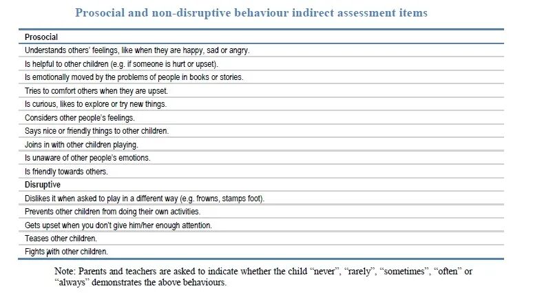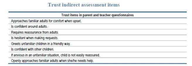 社会情感技能直接评估的内容为同理心,通过父母和老师的报告间接测量信任、亲社会和非破坏行为。