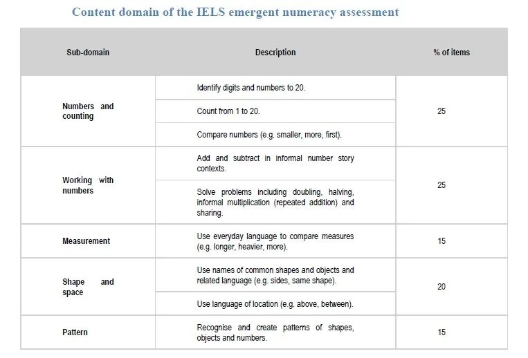 早期算术技能的评估内容具体包括数字和数数、使用数字、测量、形状和空间、模式。