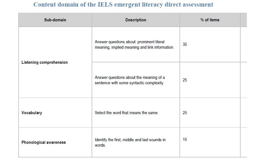 其中早期读写技能的评估内容具体包括听力理解、词汇和语音意识。