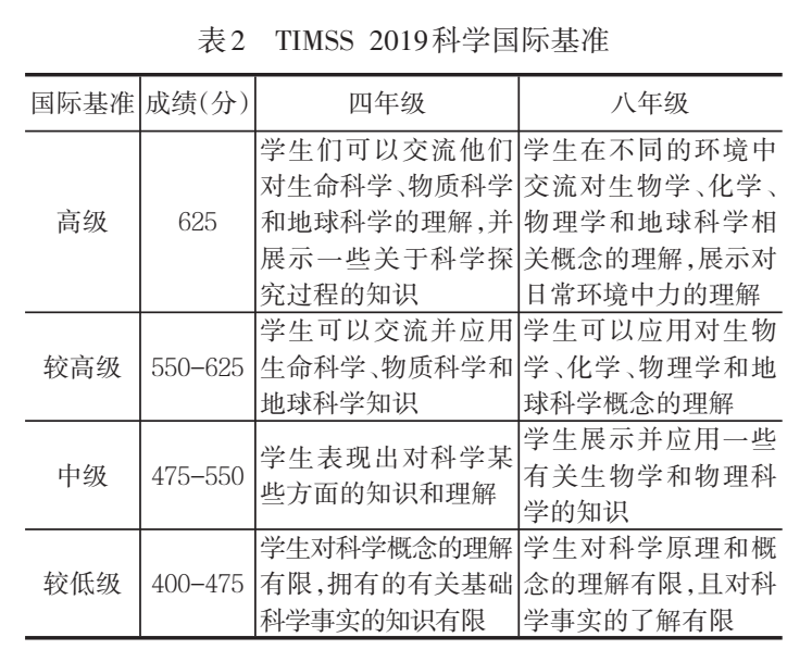 为了解释科学成就量表与学生在评估项目上的表现结果,TIMSS将各国/地区学生的科学学业成就划分为四个基准:高级国际基准(625分)、较高级国际基准(550分)、中级国际基准(475分)、较低级国际基准(400分)。表2给出四个国际基准分别代表的学生对科学知识的掌握程度。