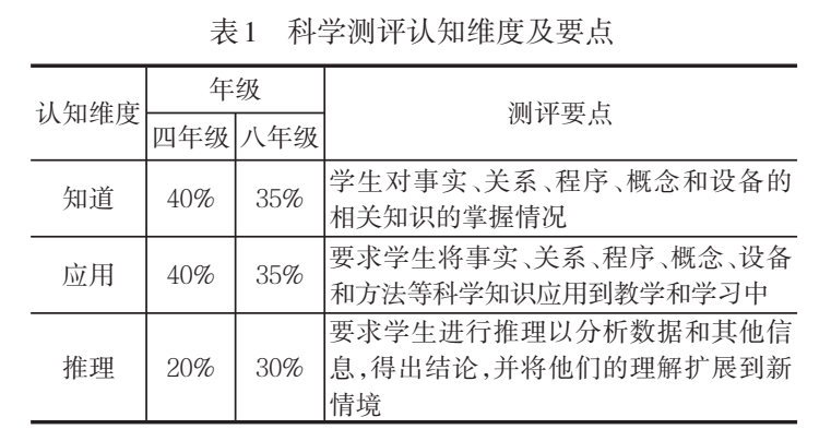 TIMSS 2019科学测评内容框架包含内容和认知两个维度。内容维度用于评估学生对科学基本概念、知识与技能的学习情况。两个年级的内容维度不同。四年级的内容维度主要包含三个领域:生命科学、物质科学和地球科学,其所占比例分别为45%、35%、20%。八年级的内容维度主要包含四个领域:生物学、物理、化学和地球科学,其所占比例分别为35%、25%、20%、20%。TIMSS将学生的认知维度分为“知道”“应用”和“推理”三个领域,由学生的测试结果和解答问题过程判断学生学习水平所处的位置。[2]表1给出测评要点和所占比例。由表1可知TIMSS侧重评价学生对课程知识内容的掌握程度。