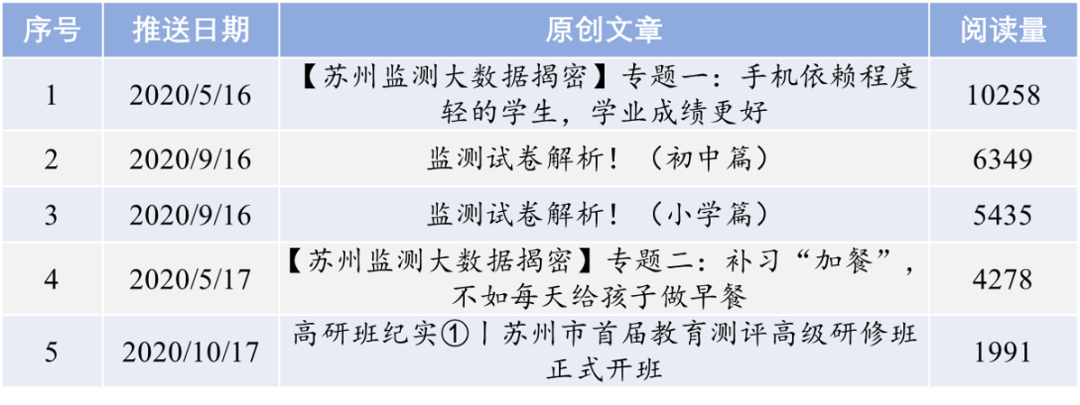 2020年,“评价万花筒”年度最热的原创文章主要是苏州监测大数据系列专题、监测试卷特色与亮点解析以及苏州市首届教育测评高级研修班等系列文章均有较高的阅读量,感谢全国各地教育同仁的关注!