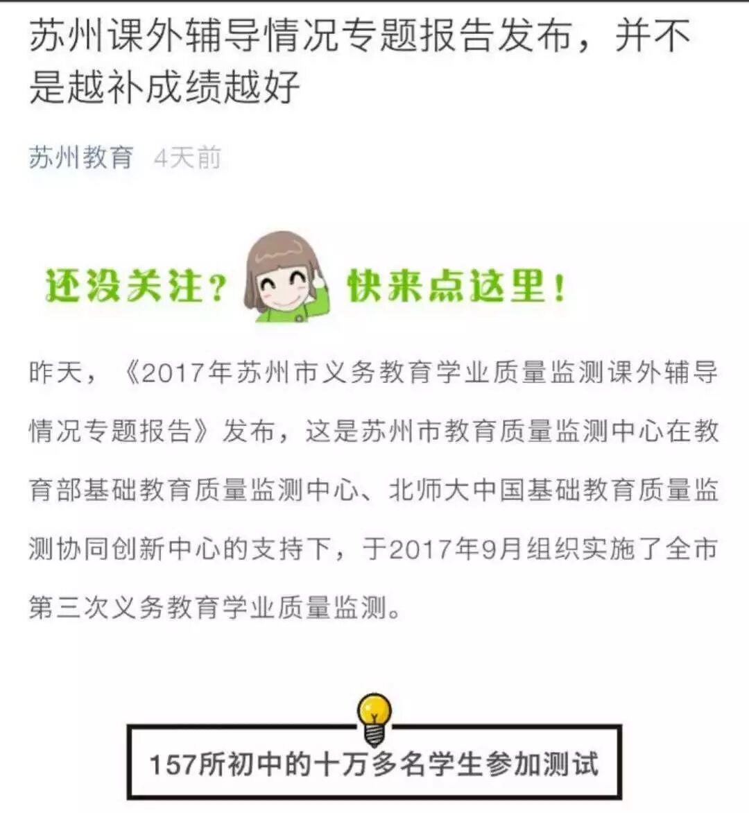 2018年7月6日下午,监测中心对媒体发布了第三方监测评价结果,主要涉及阅读情况、课外补习、学生学习行为特征方面。监测数据显示:超九成的苏州初中生喜欢阅读;学业成绩好的孩子普遍喜爱阅读;孩子每天阅读时间与学业成绩的关系呈倒U型趋势;有父母陪伴阅读的孩子学业成绩更好;平均半数初中生参加课外辅导;孩子过度补习,学业成绩反而不高;学习习惯与学业成绩的相关性最高。