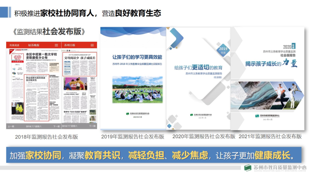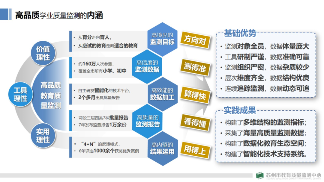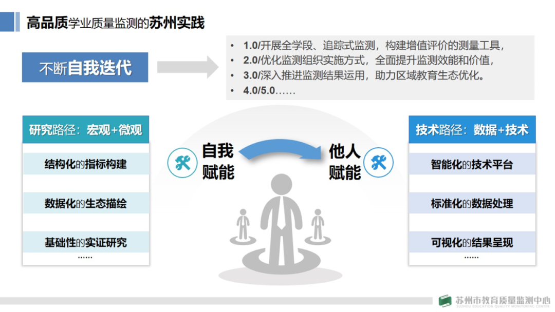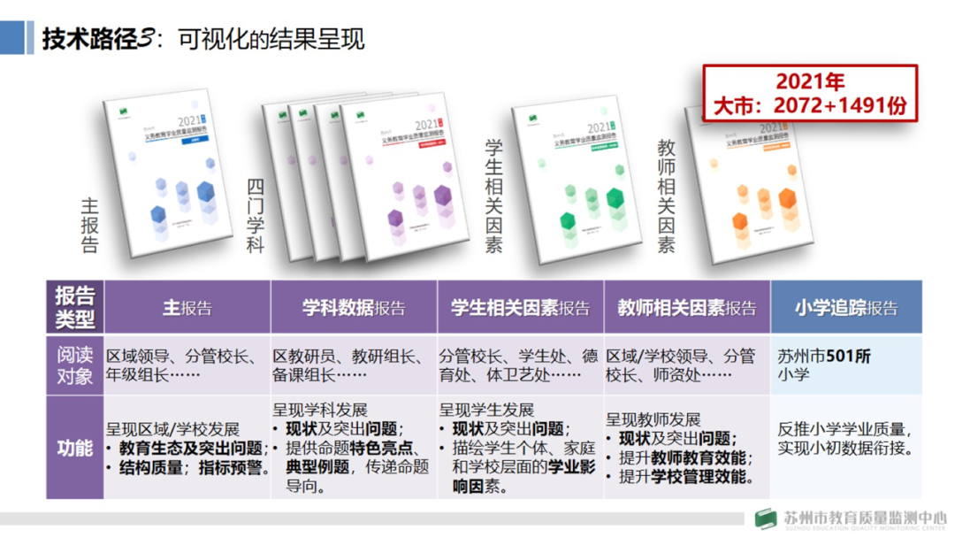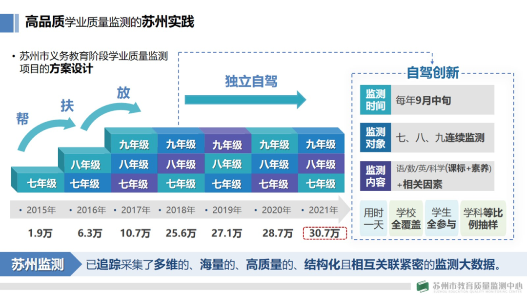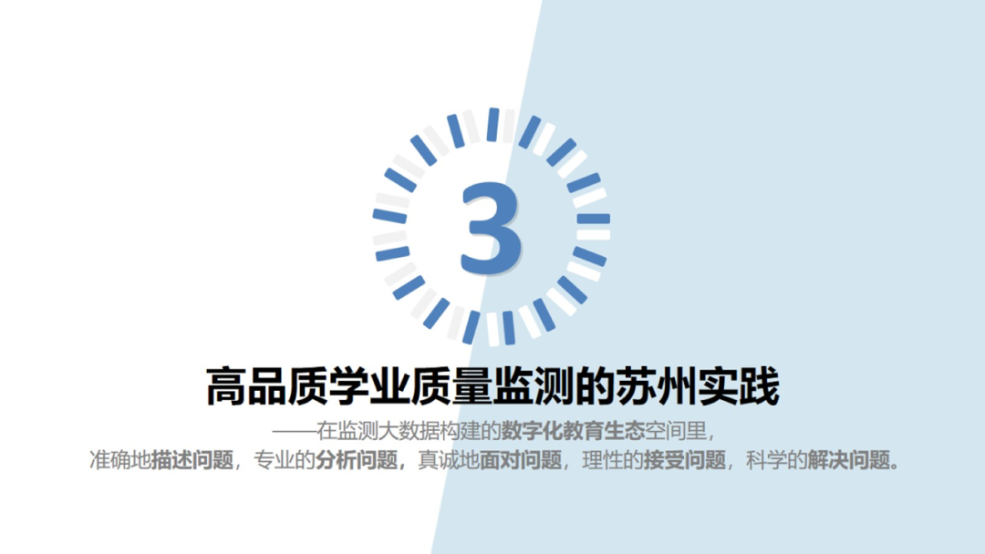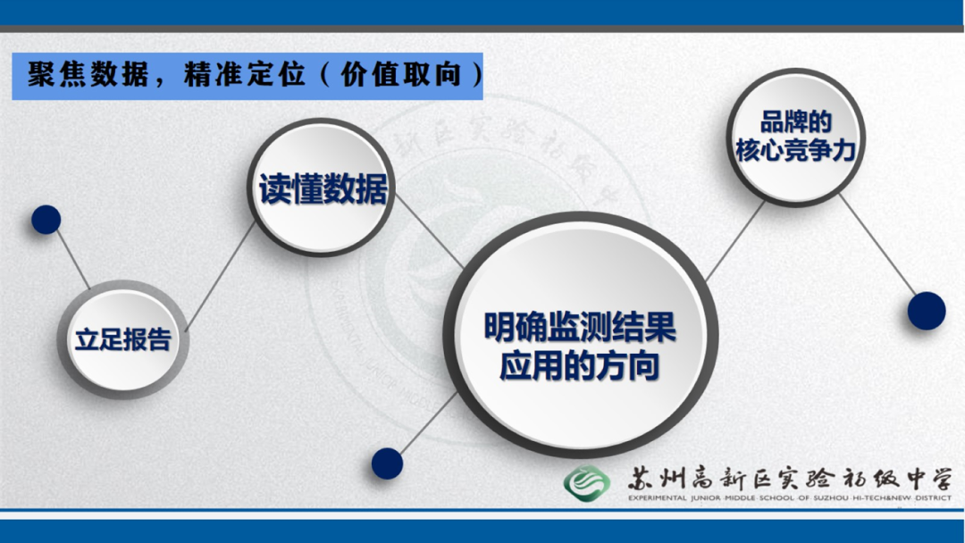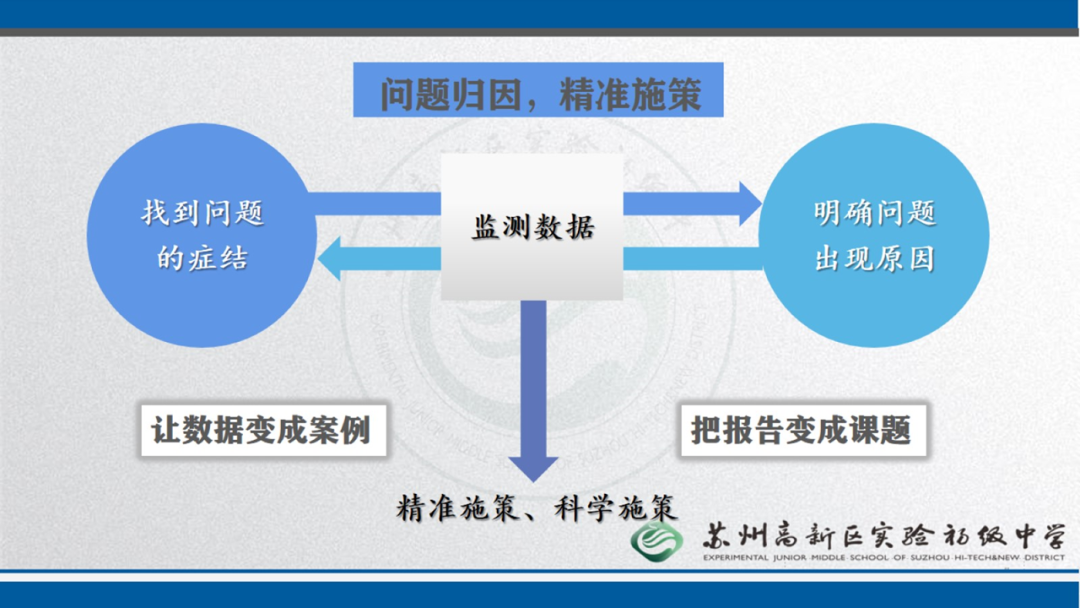 张老师从学校参与苏州市教育质量监测,到研读年度报告找问题、寻短板,寻求策略诊断改进,改良改优教育教学行为,让数据变成案例,把报告变成课题,把基于数据的教学改进作为学校品牌工作的关键点和增长点。