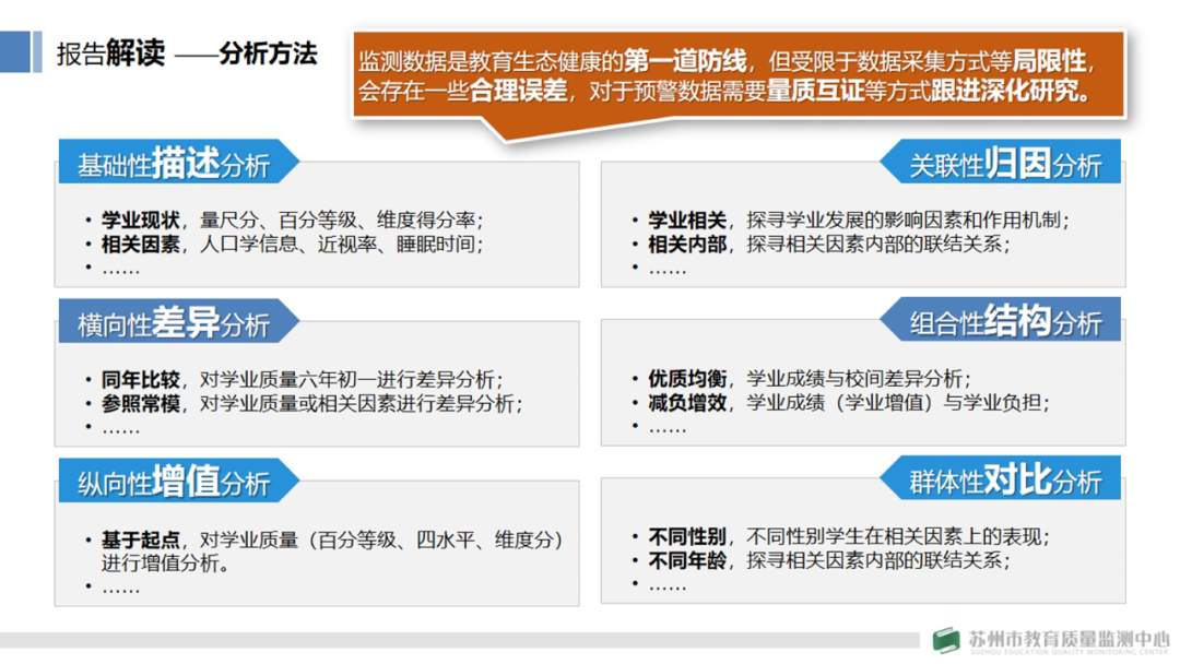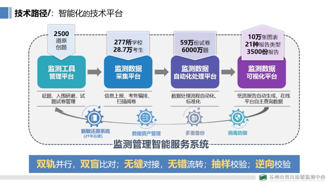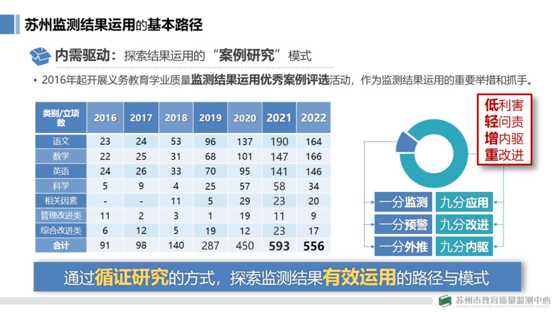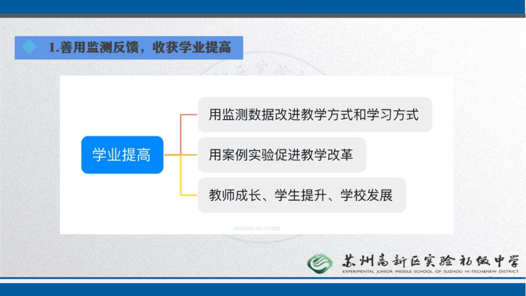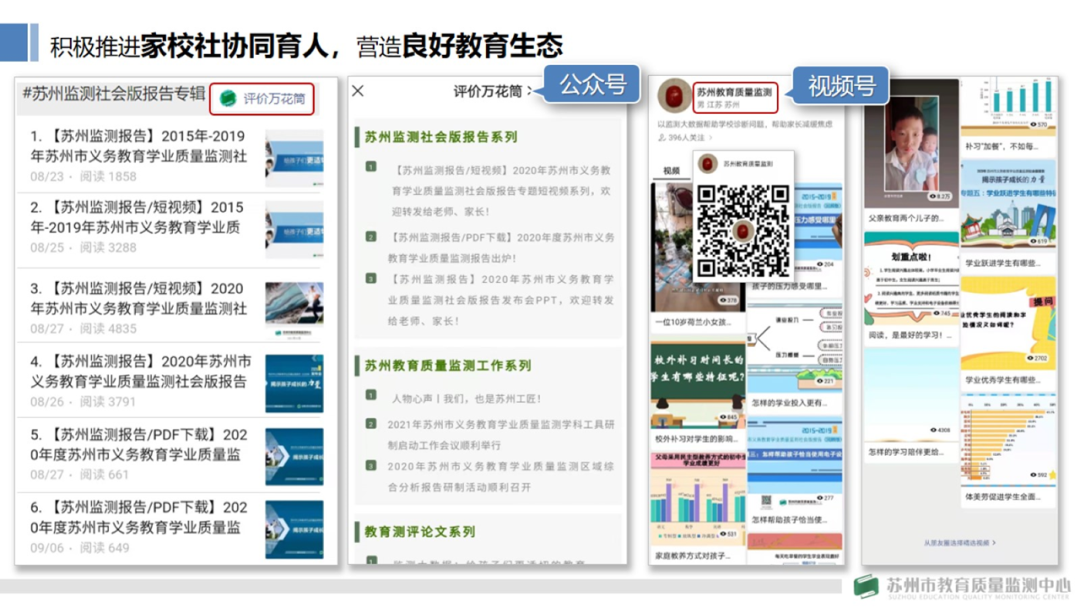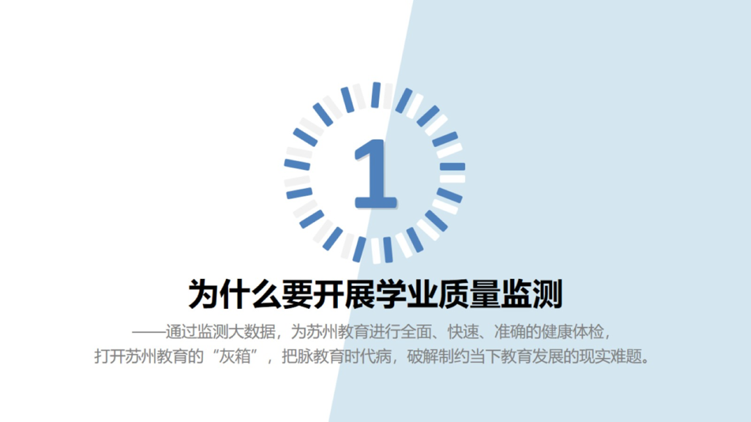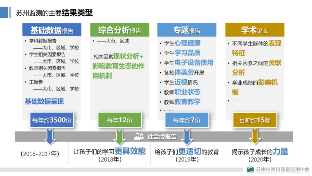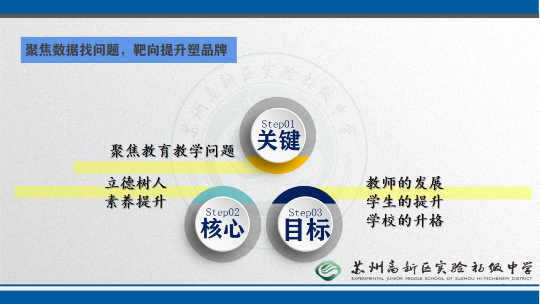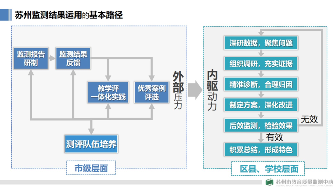 张老师从学校参与苏州市教育质量监测,到研读年度报告找问题、寻短板,寻求策略诊断改进,改良改优教育教学行为,让数据变成案例,把报告变成课题,把基于数据的教学改进作为学校品牌工作的关键点和增长点。