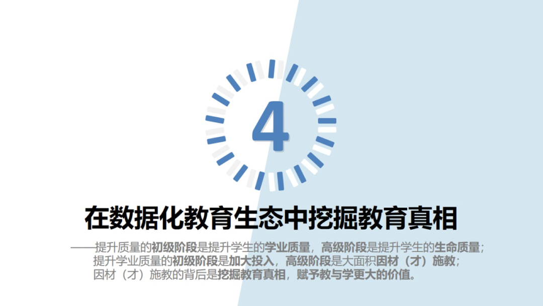 罗主任认为,提升质量的初级阶段是提升学生的学业质量,高级阶段是提升学生的生命质量;提升学业质量的初级阶段是加大投入,高级阶段是大面积因材(才)施教;因材施教的背后是挖掘教育真相,赋予教与学更大的价值。