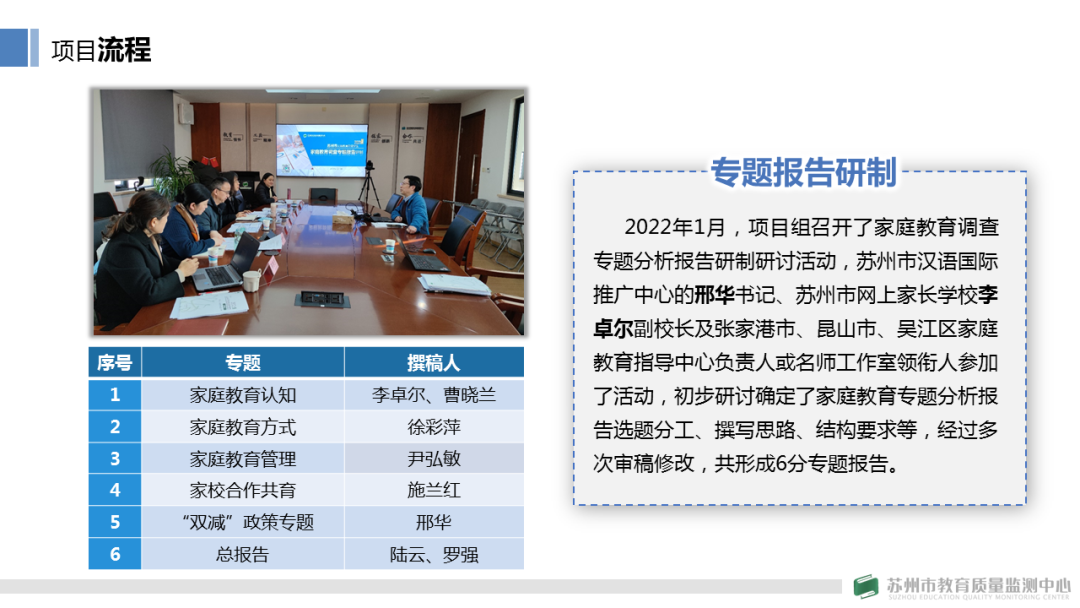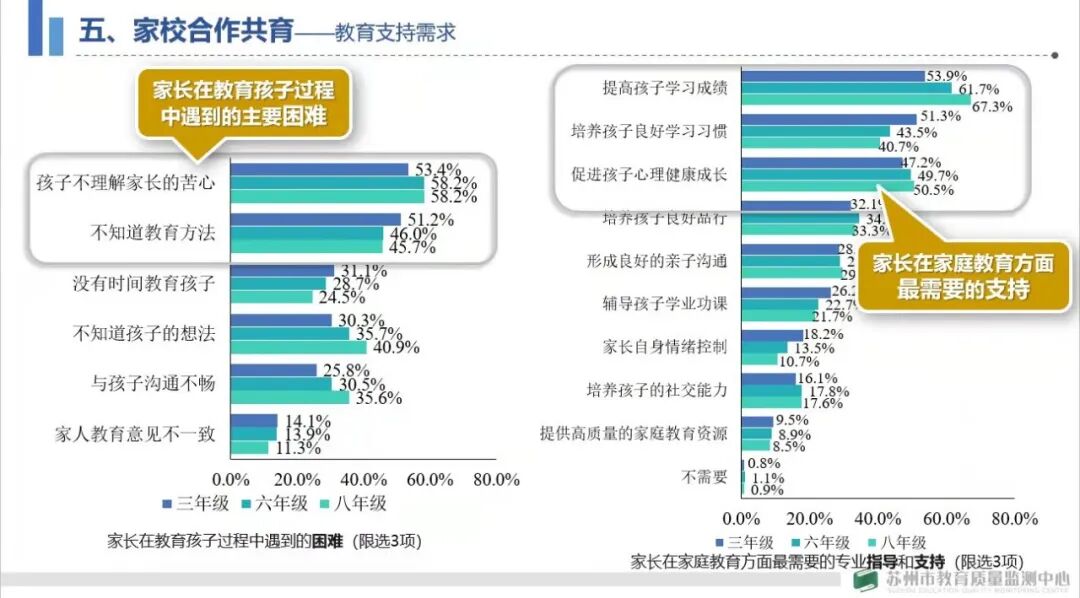本次家庭教育问卷调查项目共研制生成大市、区域、学校三级调查反馈报告共计424份,此外项目还组织苏州市家庭教育指导专家力量,围绕家庭教育重点、热点、难点问题,研制了6份专题报告,以期结合苏州本土实际、基于孩子成长规律、挖掘关键影响因素,探寻解决提升之策。