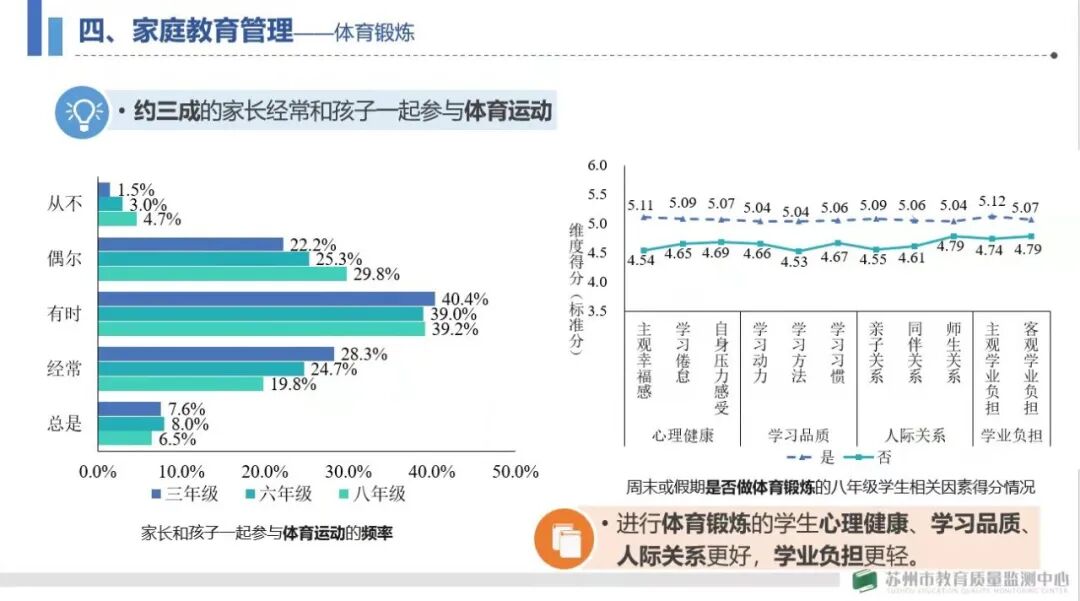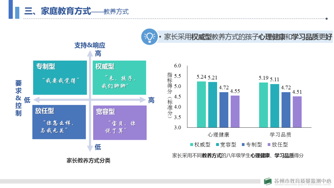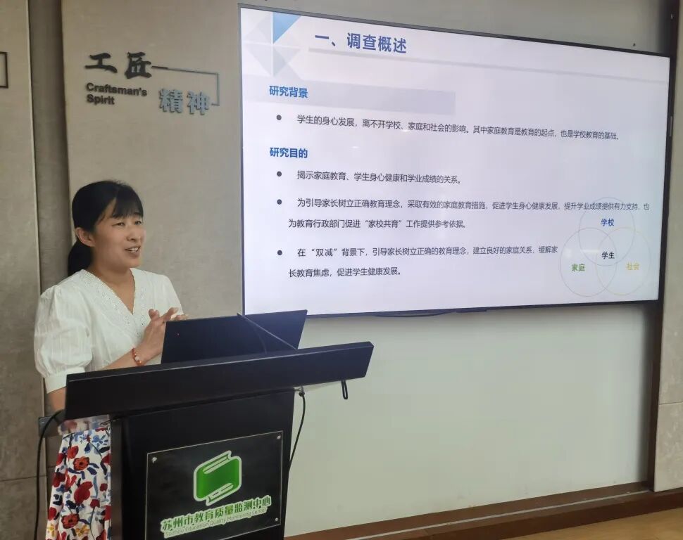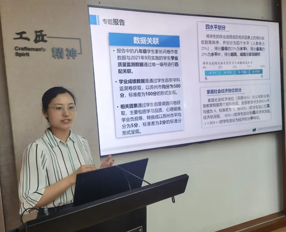 陆主任聚焦家庭教育调查中的家庭教育资源、家长教育认知、家庭教育方式、家庭教育管理、家校合作共育等方面,通过描述性分析图表直观呈现了我市家庭教育的健康体检状况以及不同群体家庭教育的差异,并通过将八年级学生家长问卷作答数据与同年9月实施的学生学业质量监测数据进行匹配关联,分析不同家庭教育因素对学生学业成绩、学习品质、心理健康等方面的影响机制。最后,她基于数据客观分析家庭教育的现状和问题,揭示科学的家庭教育理念和行为,为引导家长树立科学育儿观念,缓解家长的盲目焦虑,提升家庭教育长效,为学校推进家校共育提供有力支持,为教育行政部门完善政策提供依据参考。