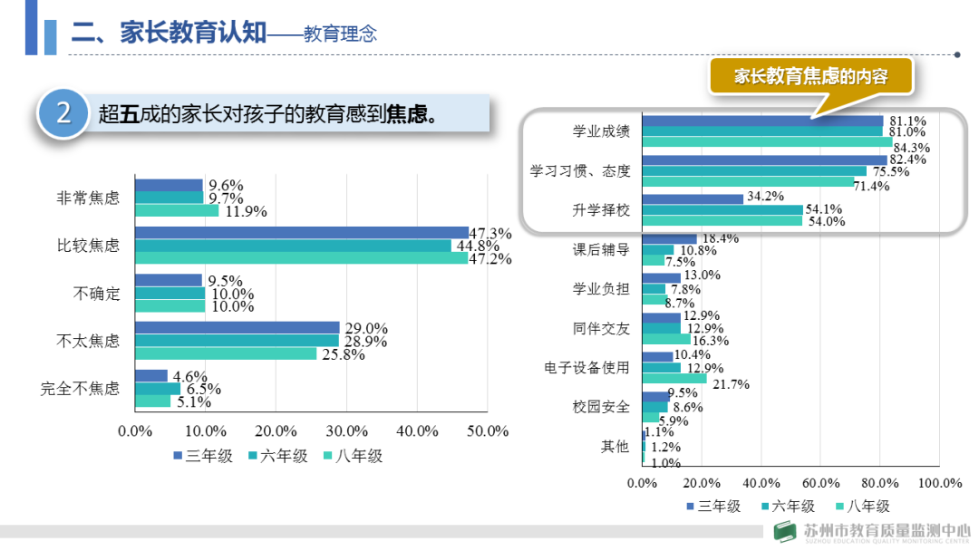 家庭教育是青少年健康发展的起点和基础,是国民教育的重要组成部分。我国首部与家庭教育相关的法律文件《中华人民共和国家庭教育促进法》颁布实施,将家庭教育由传统的“家事”,上升为新时代的“国事”。由于家长的教育对象较少,缺乏可借鉴经验,教育反馈的时效较长,纠错挽回较难,面对快速变化的社会,许多家长对家庭教育倍感迷茫和焦虑,如何通过改变家庭教育因素来促进孩子的成长发展?2021年10月,苏州市教育质量监测中心开展了面向苏州市小学三、六年级和初中八年级的学生家长的家庭教育调查项目,旨在客观分析家庭教育的现状和问题,揭示科学的家庭教育理念和行为,引导家长树立科学育儿观念,缓解家长的盲目焦虑,提升家庭教育长效,为学校推进家校共育提供有力支持,为教育行政部门完善政策提供依据参考。