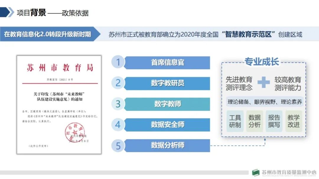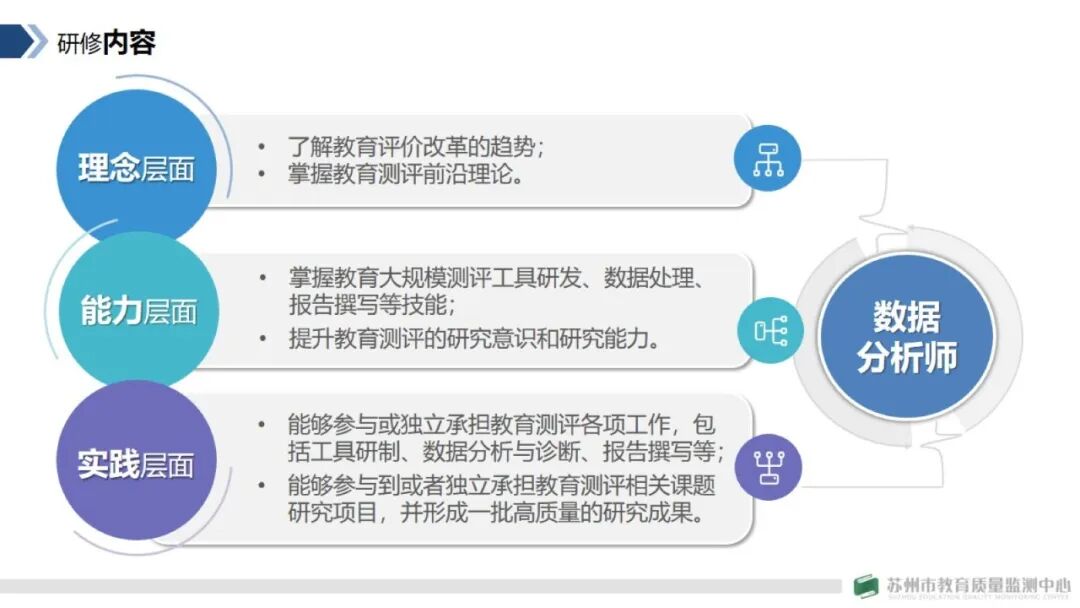 在教育信息化2.0转段升级的新时期,苏州市正式被教育部确立为2020年度全国“智慧教育示范区”创建区域,苏州市教育局以此为契机,全面提升教师信息素养,重点打造首席信息官、数字教研员、数字教师、数据分析师和数据安全师五支“未来教师”队伍。“数据分析师”培养工程作为五支“未来教师”队伍培养任务之一,旨在通过理论知识的传递与操作技能的训练,促使教师成长为具有先进教育测评理念兼具较高教育测评能力的骨干力量。为此,苏州市教育局专门制定“数据分析师”三年培养计划,具体实施工作由苏州市教育质量监测中心开展。