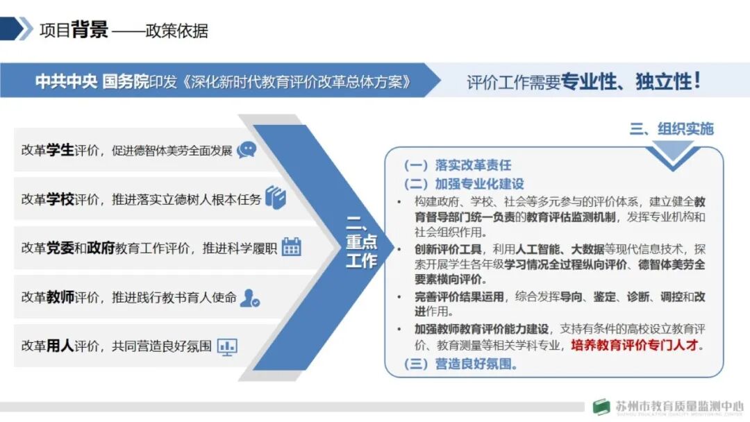 2020年10月13日,中共中央办公厅、国务院办公厅印发《深化新时代教育评价改革总体方案》,明确指出要“充分发挥教育评价的指挥棒作用”“加强专业化建设”。这是国家层面关于教育评价改革方面的文件,强调了教育测评队伍建设在评价改革中的重要作用。