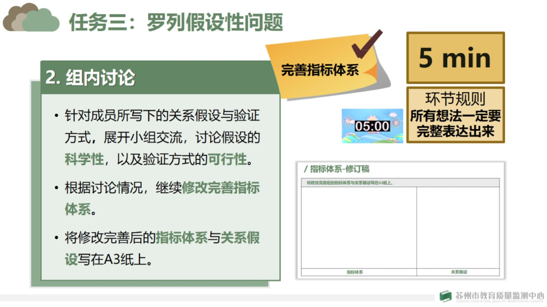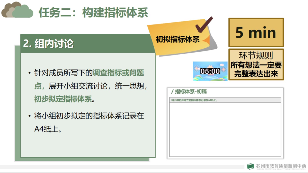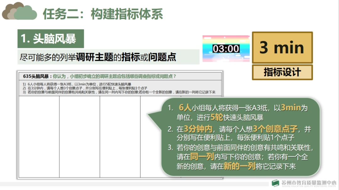 下午,罗强主任开展了《学业相关因素问卷研制工作坊》专题培训,带领学员一同探索项目化的学习方式。本节课的课程目标是让学员以小组为单位,合作设计一份诊断学生学习状况的调查问卷。活动包括明确调研主题、建立指标体系、列举假设性问题三个主要过程,通过热身运动、头脑风暴、组内讨论、创意分享等形式,引导学员从未知走向认知、从认知走向理解、从理解走向实践,使学员们在知行合一的实践操作中得到历练升华。