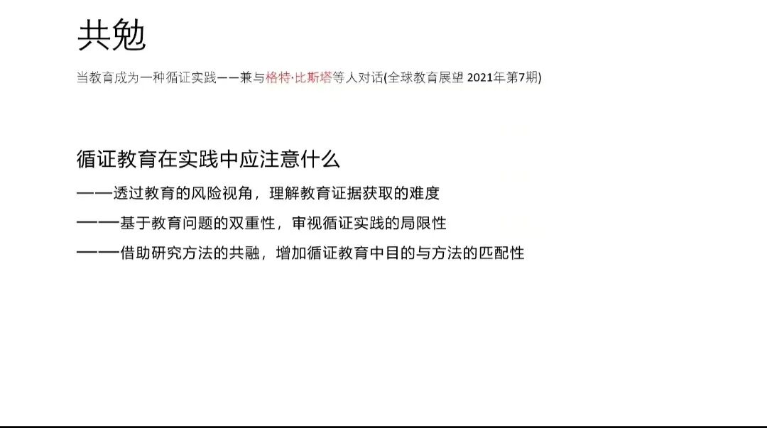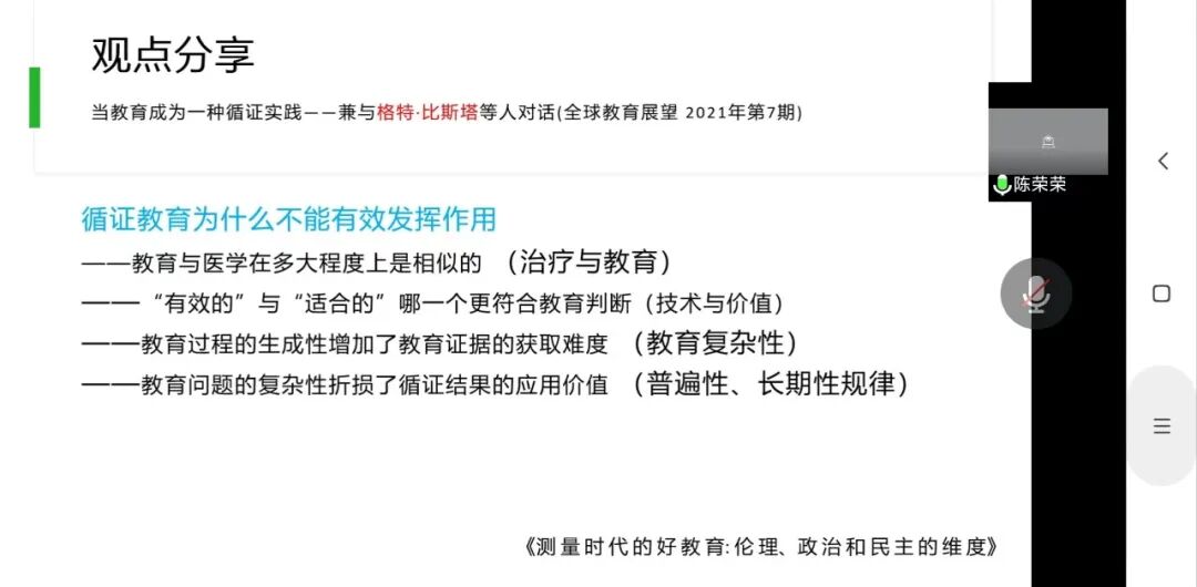 陈老师首先抛出“循证教育为什么不能有效发挥作用”问题,并对这个设问进行深入分析;接着论述教育研究中的数据作用及教育研究的四个层次——描述、预测、改进、解释;随后描述了学校自我诊断需要关注的核心要素,以及载体与方法等。陈老师总结强调,要关注学校教学管理的核心要素,并加强指导性管理;要建立数据驱动改进闭环,并完善学校质量内控机制。