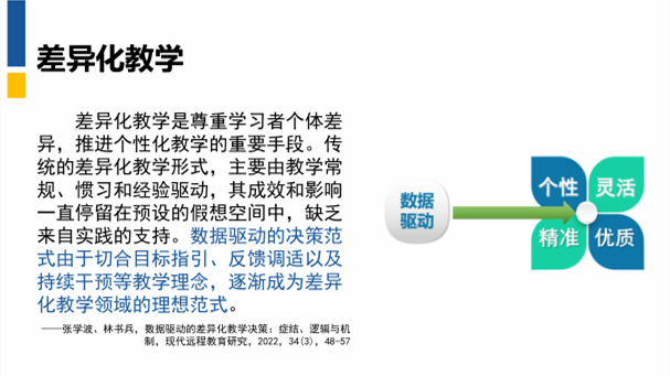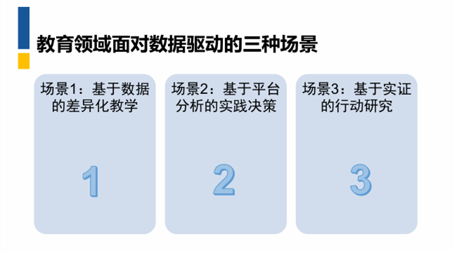 闫教授首先从教育数字化转型的国际视野出发,描述了教育领域面对数据驱动的三种场景,包括基于数据的差异化教学、基于平台分析的实践决策、基于实证的行动研究,以及每种场景中面临的多种问题。随后,针对以上场景闫教授提出数据型、分析型、探究型三类决策模式,并通过丰富的案例对每一种模式包含的过程进行详细解释。