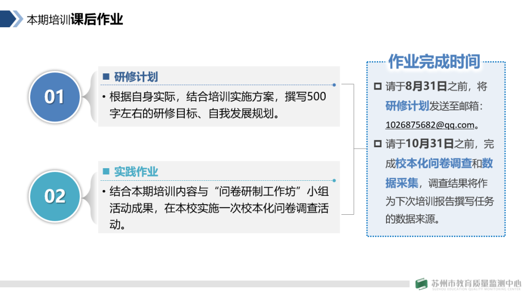 针对撰写研修规划的课后作业,罗强主任提出四个宝贵意见。第一,要自主学习,研修活动打开了教育测评的窗户,但更多的养分来自于学员的自主学习;第二,要积极实践,要在本次研修的基础上,将初步成果带回学校进行实践探索,不断提升测评能力;第三,要互助合作,研修活动以小组互助的形式开展,学员之间要互帮互助、共同成长;第四,要宣传分享,将学习成果进行宣传与分享,这既是一种共享资源的方式,也能带动其他老师树立数据意识。