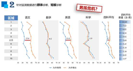 他向学员分享了在苏州教育监测数据挖据与分析过程中发现的一些教育现象与客观规律,比如,通过数据分析发现,女生群体在四门学科上的得分基本都高于男生群体,从而印证了近些年教育界比较关注的“男孩危机”现象。