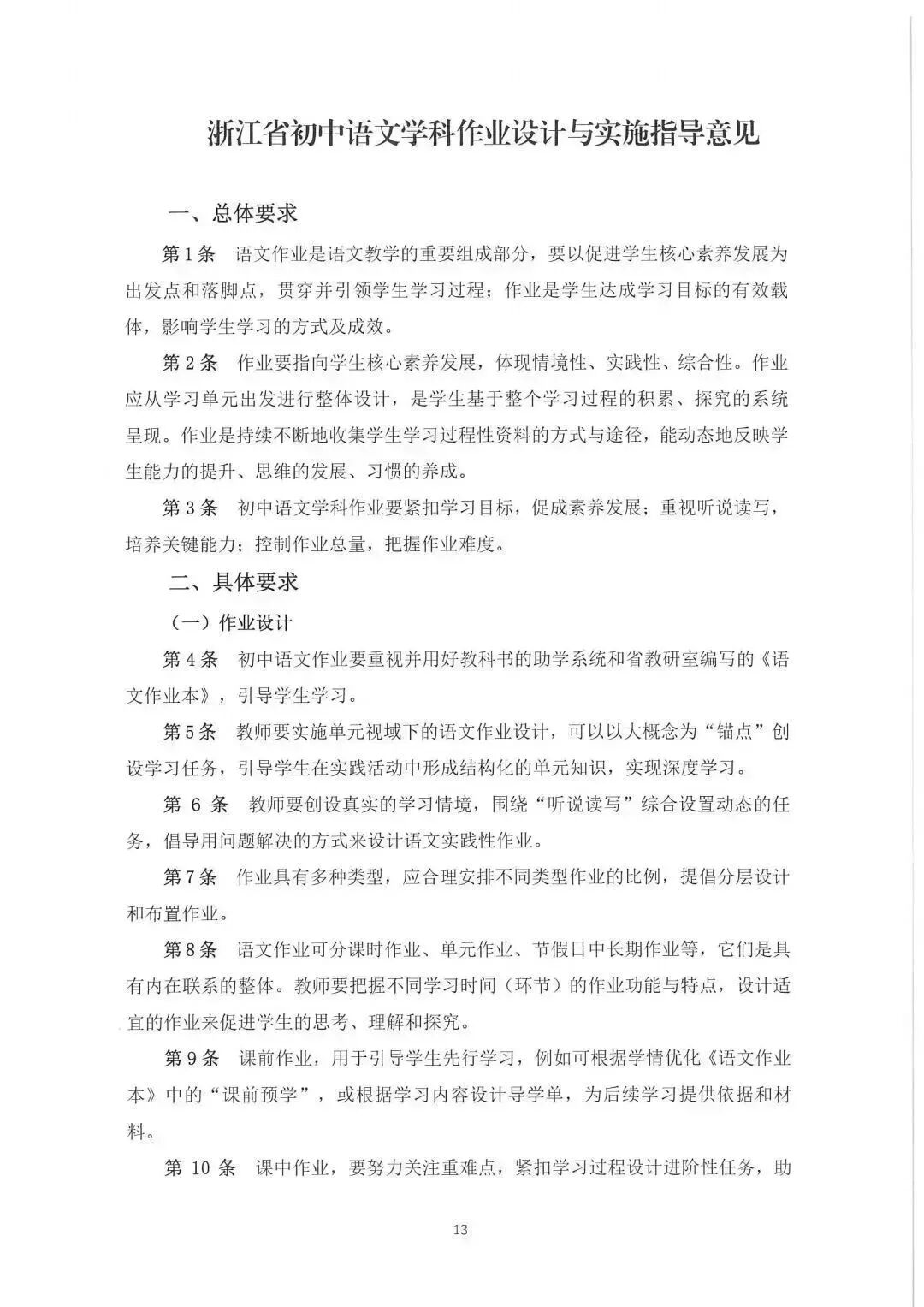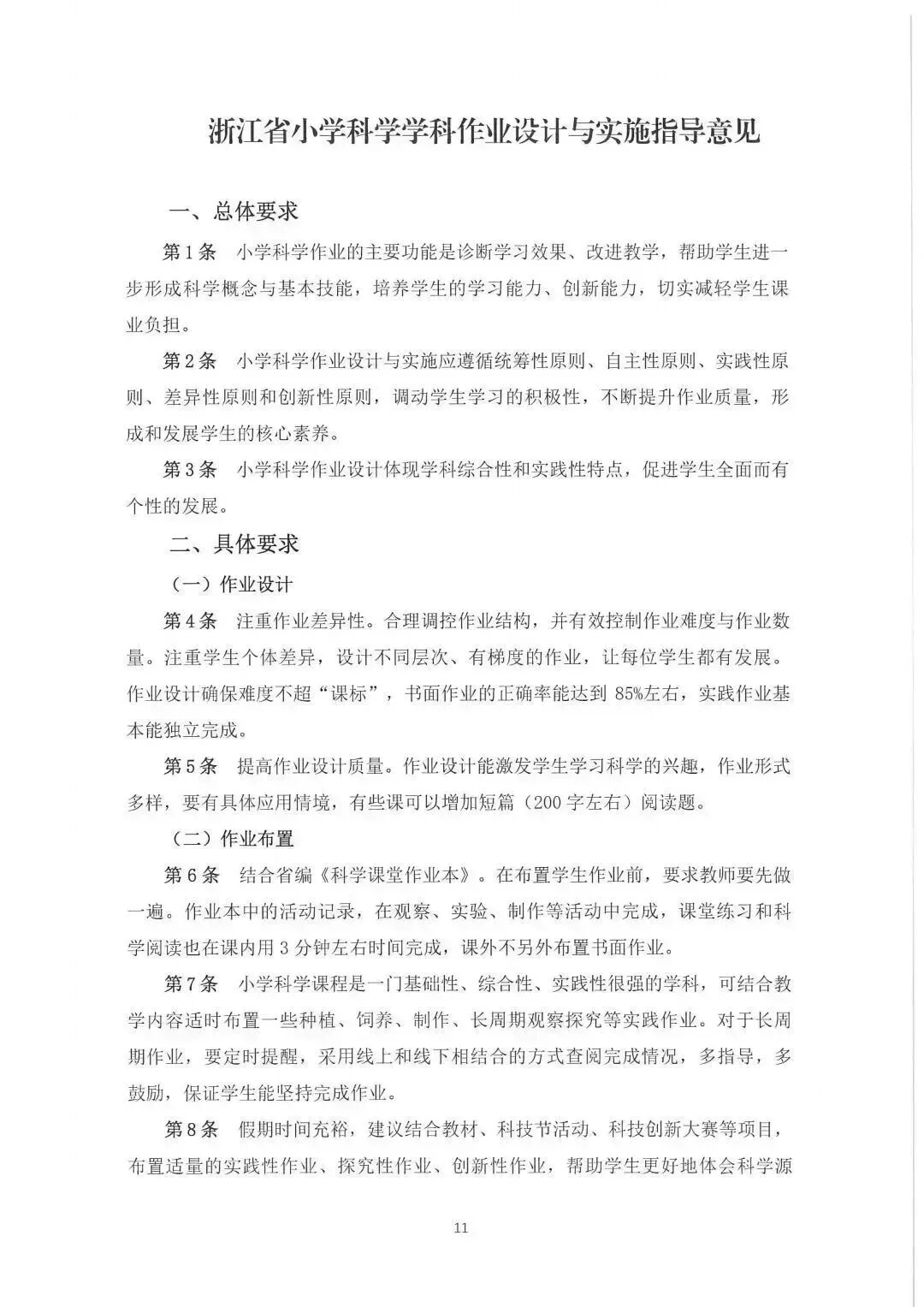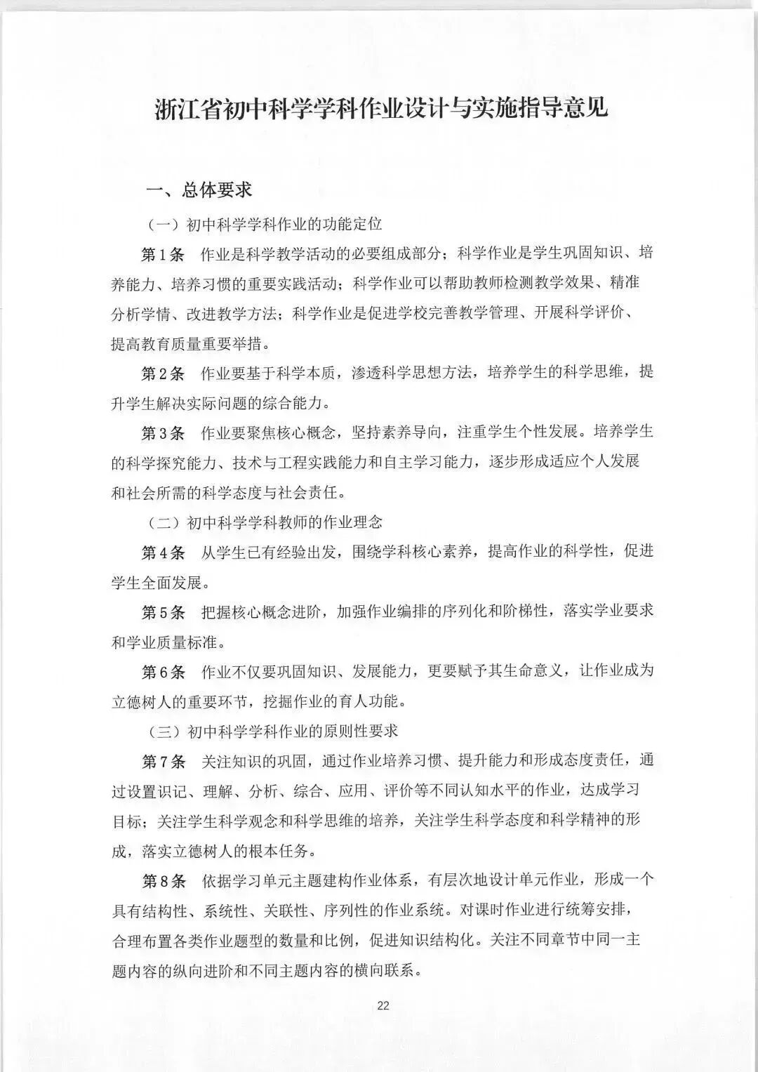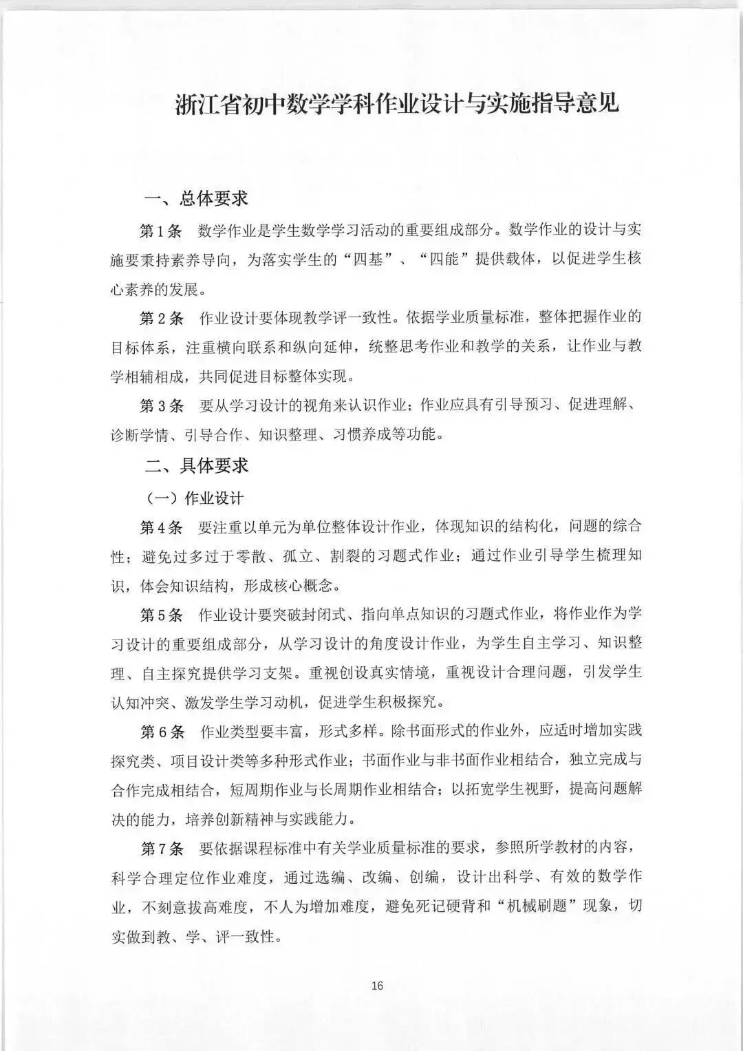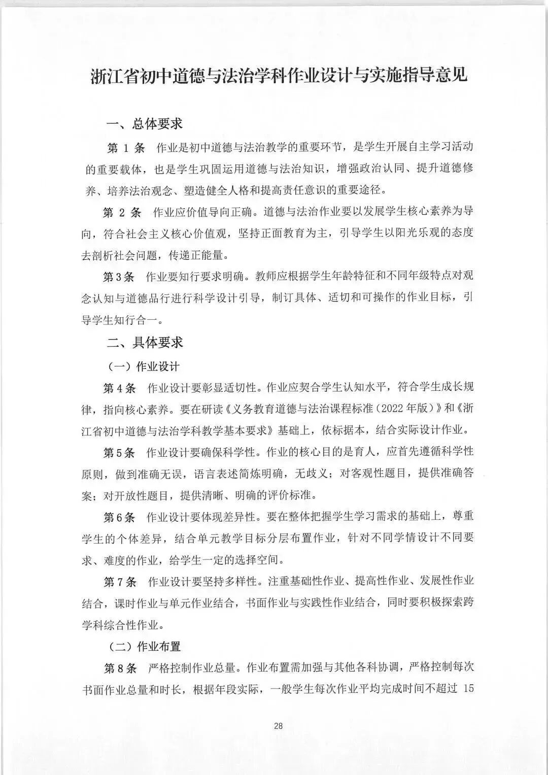 为贯彻中共中央办公厅、国务院办公厅《关于进一步减轻义务教育阶段学生作业负担和校外培训负担的意见》,结合《浙江省义务教育阶段各学科教学基本要求》与《浙江省义务教育阶段学校作业管理指导意见》,切实减轻学生过重课业负担,加强作业设计的针对性和实效性,规范作业管理,提高作业质量,特制定义务教育阶段10门学科的作业设计与实施意见,供各地在教学中参考执行。