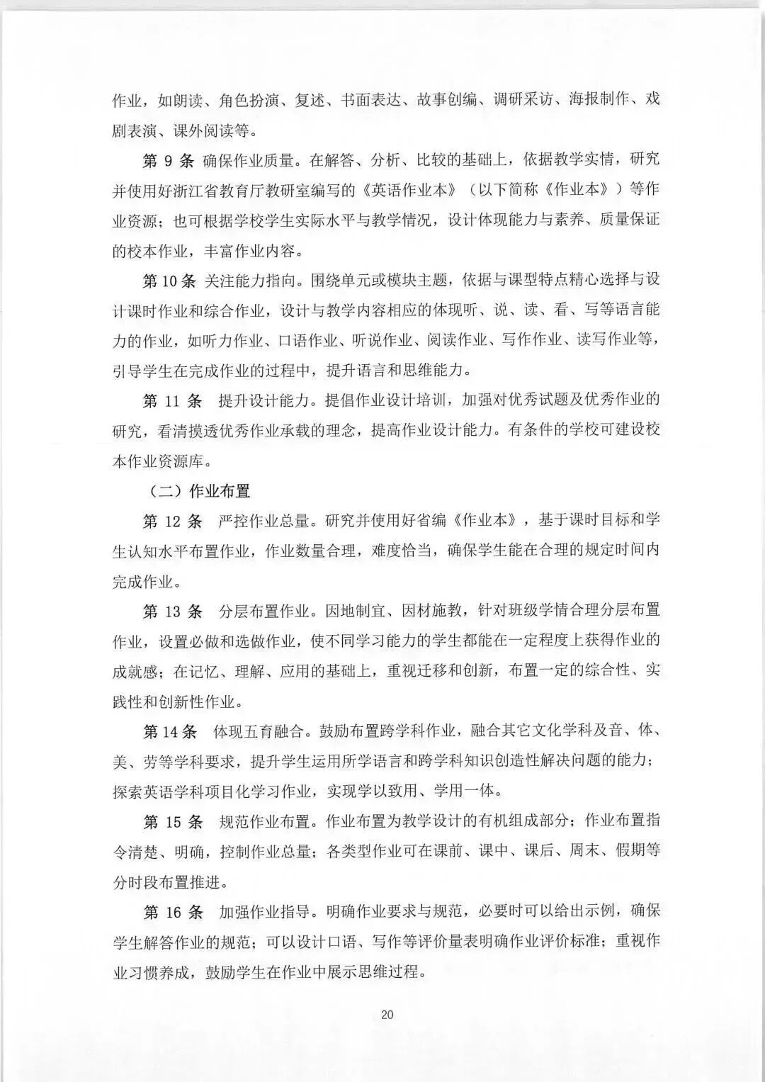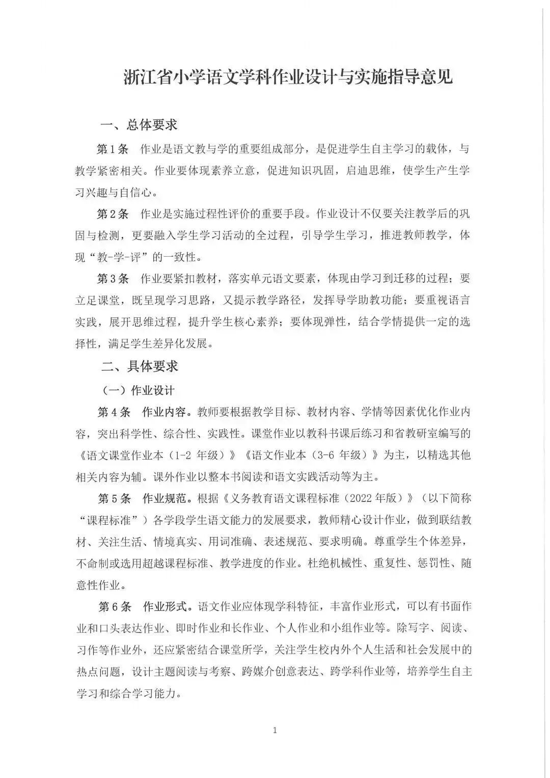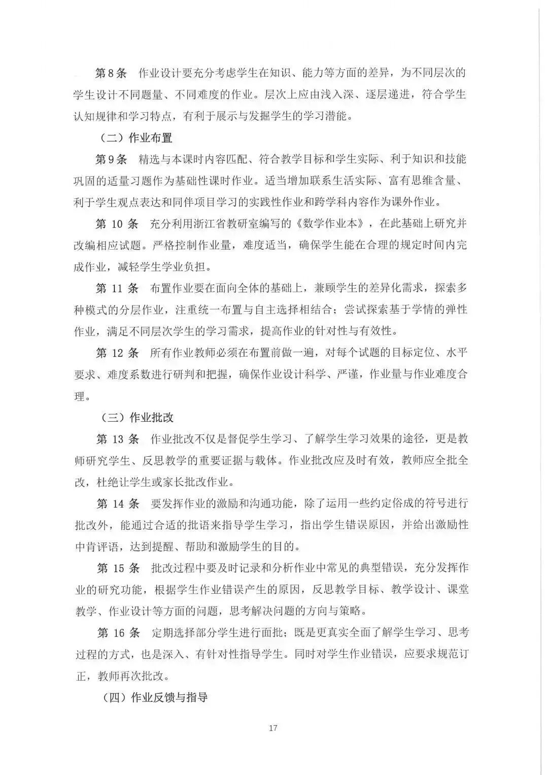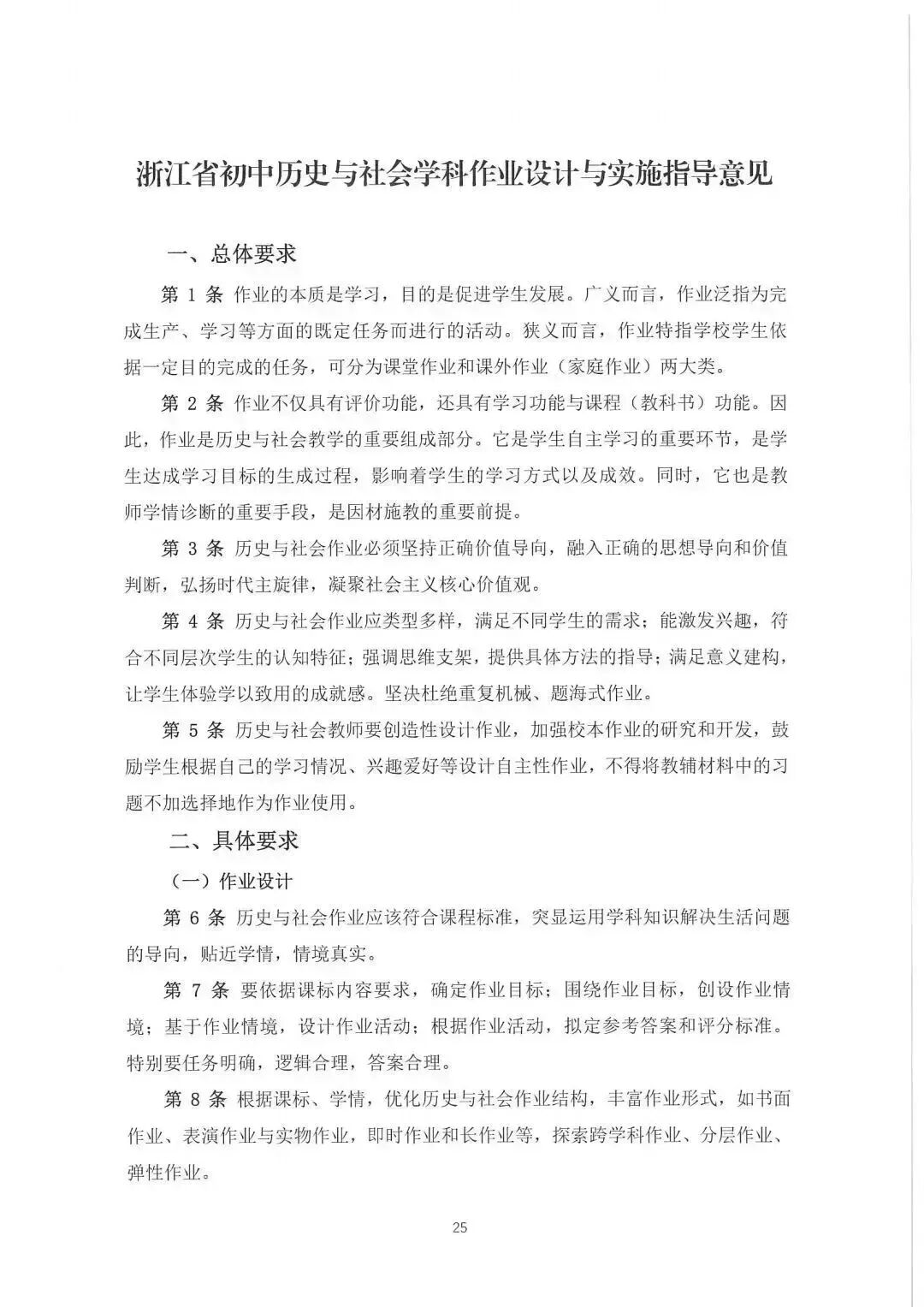 为贯彻中共中央办公厅、国务院办公厅《关于进一步减轻义务教育阶段学生作业负担和校外培训负担的意见》,结合《浙江省义务教育阶段各学科教学基本要求》与《浙江省义务教育阶段学校作业管理指导意见》,切实减轻学生过重课业负担,加强作业设计的针对性和实效性,规范作业管理,提高作业质量,特制定义务教育阶段10门学科的作业设计与实施意见,供各地在教学中参考执行。