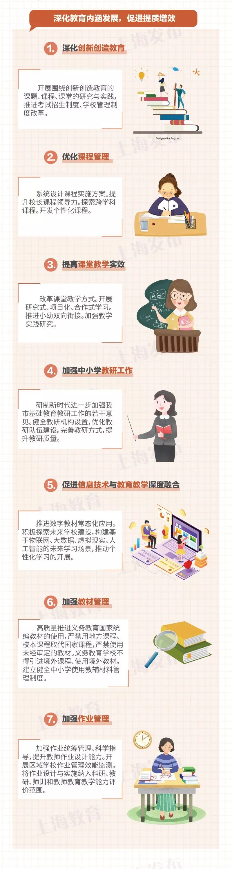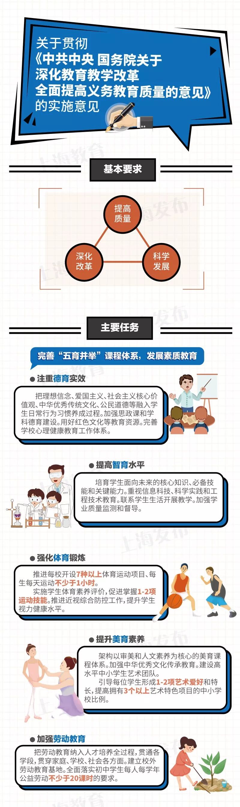 1月23日,中共上海市委、上海市人民政府发布了《关于贯彻<中共中央 国务院关于深化教育教学改革全面提高义务教育质量的意见>的实施意见》(以下简称《实施意见》)。 《实施意见》是在中共中央、国务院印发《关于深化教育教学改革全面提高义务教育质量的意见》的背景下,上海认真贯彻全国教育大会和上海市教育大会精神、全面落实党和国家义务教育战略部署,促进上海义务教育高质量发展的重要文件,旨在促进义务教育从“基本均衡”转向“优质均衡”,从“学业水平”转向“育人质量”,从“教育管理”转向“教育治理”,突出抓好教学质量、办学质量和区域教育质量,发展更有质量、更加公平、更加美好的义务教育。 五育并举,全面提高育人质量 《实施意见》突出义务教育“五育并举”,将完善“五育并举”课程体系作为首要的改革任务。注重德育实效,突出理想信念、爱国主义、社会主义核心价值观、中华优秀传统文化、公民道德、心理健康等方面的教育、实践和品质养成;提高智育水平,培育学生面向未来的核心知识、必备技能和关键能力;强化体育锻炼,推进每校开设7种以上运动项目、每生每天运动不少于1小时,促进学生掌握1-2项运动技能;提升美育素养,引导每位学生形成1-2项艺术爱好和特长,提高拥有3个以上艺术特色项目的学校比例;加强劳动教育,把劳动教育纳入人才培养全过程,贯通各学段,贯穿家庭、学校、社会各方面,推进学校劳动教育规范化、家庭劳动教育日常化、社会劳动教育多样化,落实初中生每人每学年不少于20课时的公益劳动要求。 《实施意见》还突出强调要深化创新创造教育,促进学生学会学习。在创新创造教育方面,强调要开展围绕创新创造教育的课题、课程、课堂的研究与实践,推进考试招生制度、学校管理制度改革,重视信息科技、科学实践和工程技术教育,支持学校和教师开展各种创新创造教育实验,引导学生学会创意,提升创新创造能力。在优化学生学习方式方面,强调要探索基于学科的课程综合化教学,开展探究式、项目化、合作式学习,探索因材施教的有效路径和深度学习的实践模式;要促进信息技术与教育教学深度融合,构建基于物联网、大数据、虚拟现实、人工智能的未来学习场景,推动学生个性化学习的开展。