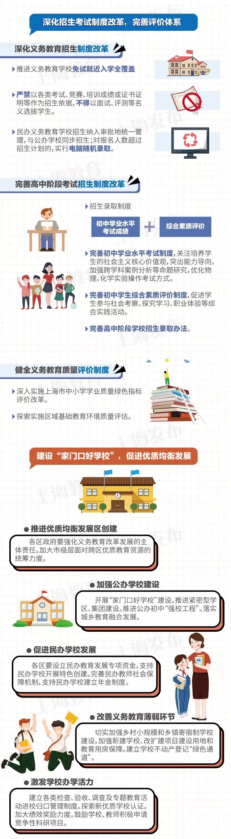 多措并举,积极回应社会关切 《实施意见》明确了义务教育重点领域的改革任务。 在优质均衡方面,促进公民办学校协调发展。一方面强调加强公办学校建设,通过紧密型学区集团建设、公办初中“强校工程”、城乡学校携手共进计划、新优质学校建设等方面,努力办好家门口的学校,让市民就近享受优质教育资源。另一方面注重支持民办学校发展,在经费支持、特色建设、教师队伍建设等方面明确了支持政策。 在招生入学方面,推进义务教育学校免试就近入学全覆盖,公民办学校同步招生,对报名人数超过招生计划的民办学校实行电脑随机录取,强调不挑选生源,有教无类。 在防止学生负担过重方面,在课内,重点是高质量落实国家课程方案和课程标准,提高学校教学效果,激发和保护学生的好奇心、想象力、求知欲,发挥学校在学生发展中的主导作用;在课外,家庭教育指导和治理培训市场“双管齐下”,引导家长树立科学育儿观念,加强培训机构全方位监管,防止学生课外负担过重。