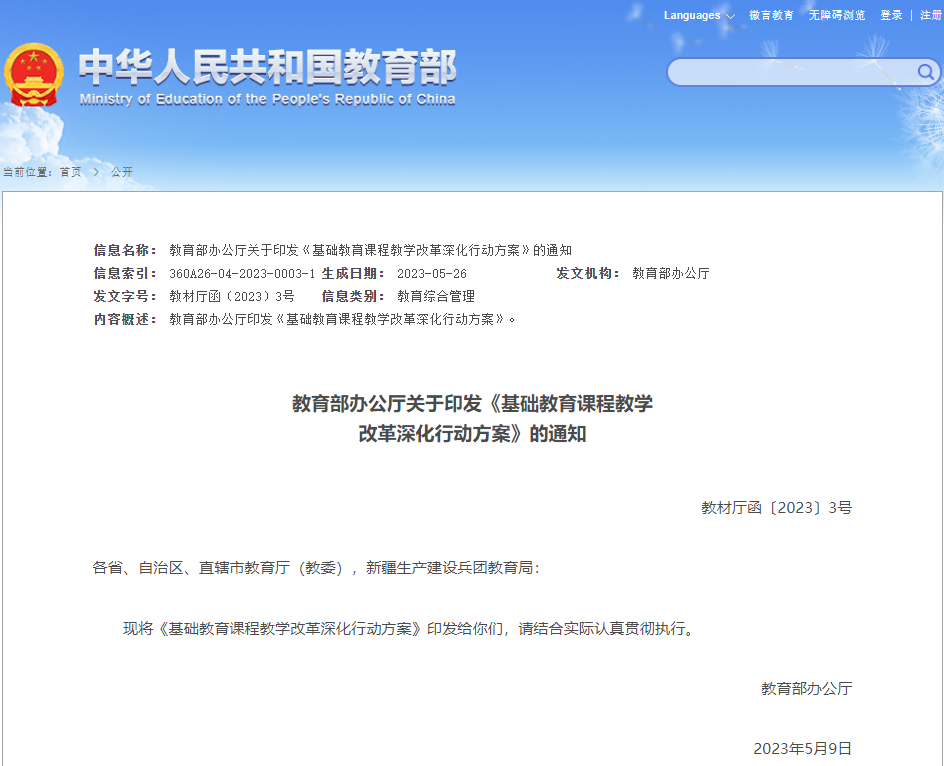 为贯彻党的二十大精神,落实立德树人根本任务,办好人民满意的教育,教育部决定推进实施“基础教育课程教学改革深化行动”,制定本行动方案。 以习近平新时代中国特色社会主义思想为指导,坚持为党育人、为国育才,全面贯彻党的教育方针,落实立德树人根本任务,发展素质教育,促进教育公平。深化课程教学改革,加强机制创新,指导、发动各地和学校深化育人关键环节和重点领域改革,更新教育理念,转变育人方式,坚决扭转片面应试教育倾向,切实提高育人水平,促进学生德智体美劳全面发展。 2023年启动,有组织地持续推进基础教育课程教学深化改革。至2027年,形成配套性的常态长效实施工作机制,培育一批深入实施新课程的典型区域和学校;总结发现一批教学方式改革成果显著、有效落实育人要求的教育教学案例;教师教学行为和学生学习方式发生深刻变化,教与学方式改革创新的氛围日益浓厚,基础教育课程教学改革形成新气象。 (一)课程方案转化落地规划行动 在课程实施过程中,切实加强国家课程方案向地方、学校课程实施规划的转化工作。坚持因地制宜“一地一计”、因校制宜“一校一策”,把国家统一制定的育人“蓝图”细化为地方和学校的育人“施工图”,明确课程教学改革的具体路线、措施,提出困难问题破解之策。坚持循证决策,健全监测反馈机制,持续优化改进课程实施规划。 1.制订课程实施的区域规划。省级教育行政部门切实落实课程建设与管理主体责任,明确地方和学校职责。依据国家课程方案,分别对义务教育国家、地方、校本课程实施和普通高中必修、选择性必修、选修课程实施进行整体规划,注重赋予地方和学校课程实施自主权。全面把握本地区基础教育课程教学改革现状,分析课程教学改革推进过程中的重难点问题,开展广泛深入专业的调查研究,强化严密论证,建立基于证据的决策机制,编制省级义务教育课程实施办法和普通高中课程实施指导意见。 2.制订课程实施的学校规划。地方各级教育行政部门及专业机构督促指导学校根据培养目标,立足办学理念和学生发展需要,分析资源条件,因校制宜规划学校课程及其实施。学校以促进学生全面而有个性地发展、健康成长为目标,高质量落实国家课程,建设校本课程,将课程理念、原则要求转化为具体的育人实践活动,构建体现学校办学特色的课程育人体系,注重持续优化。义务教育阶段确保全面落实国家课程,注重与地方课程和校本课程的统筹实施;普通高中保证开齐开好必修课程的基础上,注重适应学生特长优势和发展需要,提供分层分类、丰富多样的选修课程,形成体现学校办学特色的课程系列。 3.健全课程实施监测体系。开展国家、省两级课程实施监测,研制监测关键指标,重点监测课程实施状况和学生核心素养发展状况,形成反馈改进机制,为有效推进课程实施提供参考依据。 (2023年5月前部署安排,至2027年持续推进。) (二)教学方式变革行动 落实课程方案和课程标准,全面推进教学方式变革,通过实验区实验校试点先行、示范引领,着力解决重难点问题,通过精品课遴选、教学成果推广应用带动各地各校广泛参与,不断深化教学改革,提高教学质量。 4.实施教学改革重难点攻坚。教育部遴选一批国家级基础教育教学改革实验区、实验校,各级教育行政部门结合本地实际,相应设立一批实验区、实验校,依托专业机构建立指导支持机制,聚焦核心素养导向的教学设计、学科实践(实验教学)、跨学科主题学习、作业设计、考试命题、综合素质评价等教学改革重点难点问题,探索不同发展水平地区和学校有效推进教学改革的实践模式。 5.扩大精品课遴选规模。以基础教育精品课遴选工作为抓手,引导广大教师深入研究课程教材内容和课堂教学规律,创新教学设计和教学方法,鼓励指导每个教师积极参与各级精品课遴选。组织各级优课展示交流活动,开展教学说课评课,示范带动广大教师变革教与学方式,尊重学生主体地位,发挥教师主导作用,注重启发式、互动式、探究式教学,克服单纯教师讲学生听、教知识学知识等现象,引导学生主动思考、积极提问、自主探究。 6.实施优秀教学成果推广应用计划。全面总结教学成果推广应用示范区经验成效和应用模式,进一步扩大推广应用范围和项目。实施中西部教学支持计划,遴选一批适用于中西部地区的教学改革成果,加大推广应用力度,促进成果“本土化”落地。 (2023年5月前部署安排,至2027年持续推进。) (三)科学素养提升行动 落实党的二十大关于教育、科技、人才三位一体布局战略要求,针对讲得多做得少,学生对科学技术缺乏内在兴趣等问题,深化中小学科学教育改革,强化做中学、用中学、创中学,激发青少年好奇心、想象力、探求欲,提升学生解决实际问题的能力,发展学生科学素养。 7.加强科学类学科教学。指导地方开齐开足科学课程,通过多种方式补充配齐科学课教师。强化跨学科综合教学,遴选推广一批跨学科综合性实践性教学优秀案例。加强实验教学,强化学生动手操作实验,将学校实验课开设情况纳入教学视导和日常督导,将实验操作纳入中考。加强科学教育实践活动,遴选一批科技馆、博物馆、研学基地、高科技企业等,作为中小学科学教育实践基地,结合科学课程标准,设计相应的科学实践活动,组织学生在实践探究